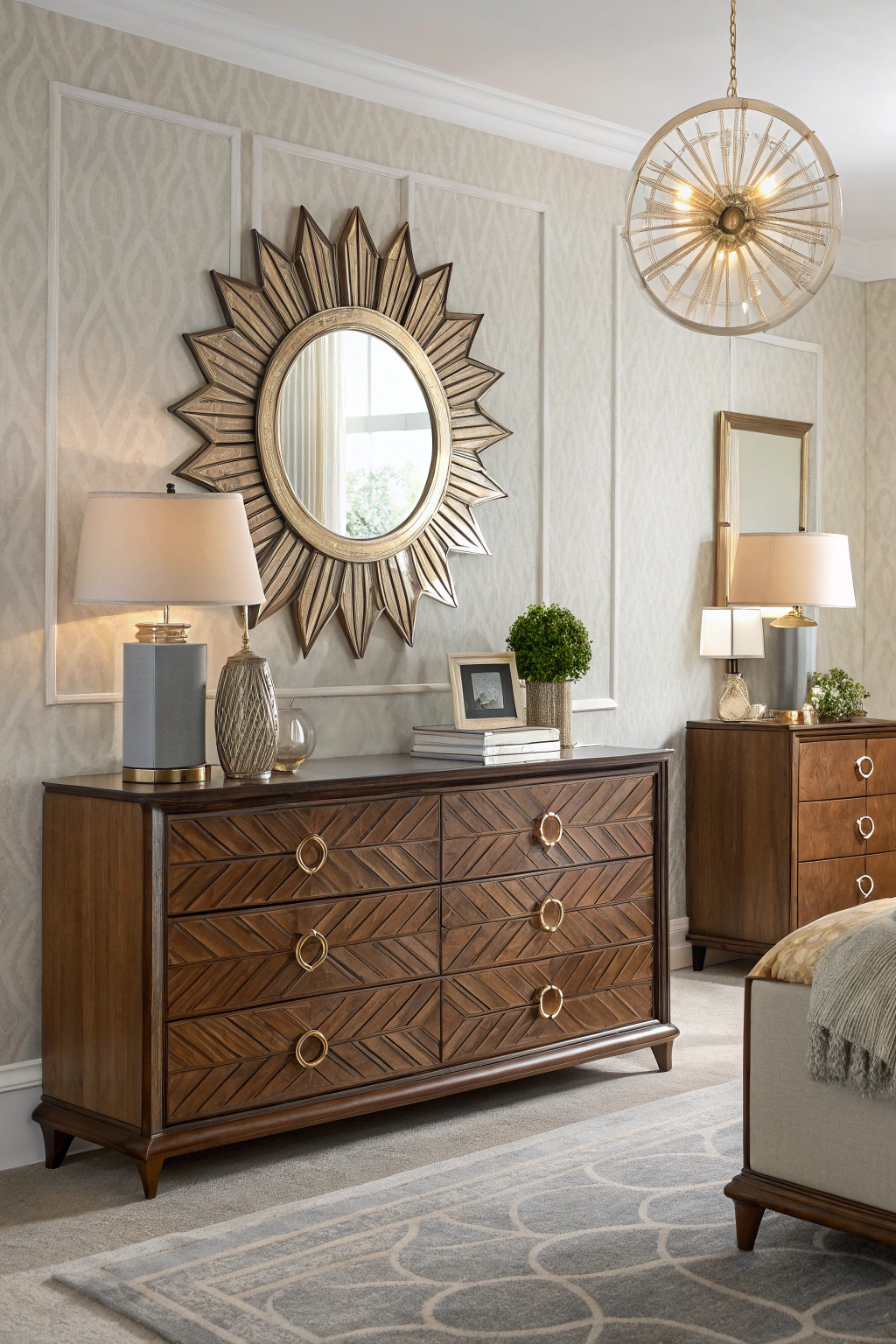 PinOrnamental mirrors can transform the ambiance of your Art Deco bedroom while serving as stunning focal points. Choose geometric shapes or sunburst designs to echo the era's unique style. Place them above the dresser or as statement pieces on the wall. The reflective surfaces not only enhance light but also create an illusion of space, making your bedroom feel larger and more inviting.