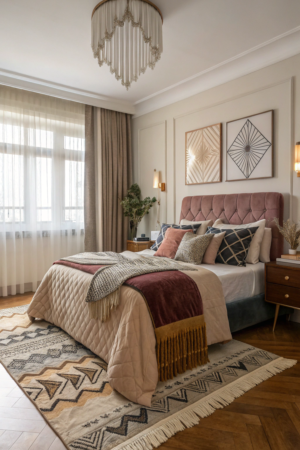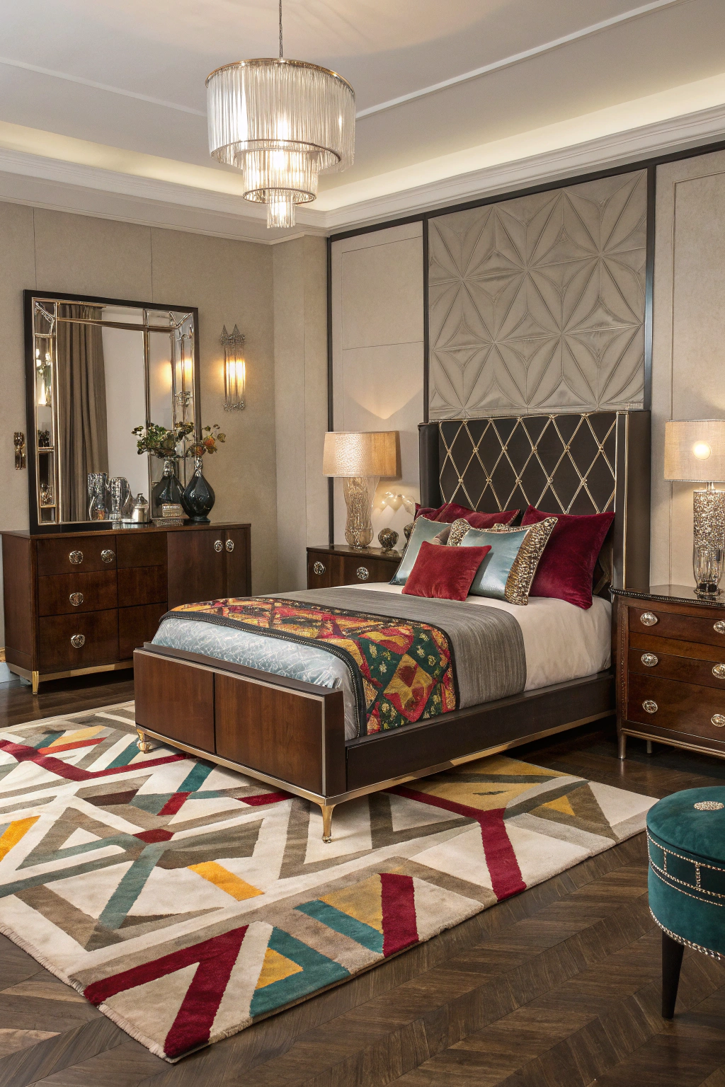 PinTransform your Art Deco bedroom into a cozy retreat with layered textiles and rugs that evoke both comfort and style. Combine various patterns and textures to create visual interest and warmth. Consider incorporating: