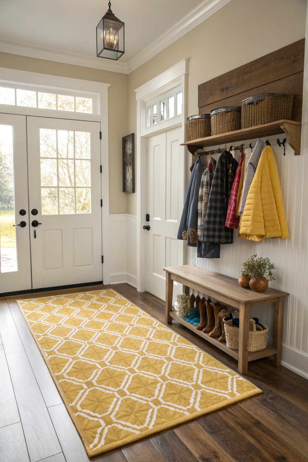 PinA welcoming rug can instantly set the tone for your entryway, making it feel warm and inviting. Choose a rug that complements your style, whether it's a bright pattern or a cozy neutral. Make certain it's durable and easy to clean, as it'll face foot traffic. Position it strategically to define your space and encourage guests to wipe their shoes before entering.