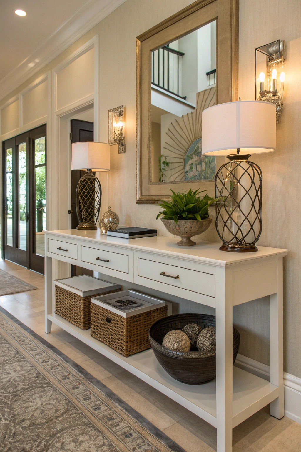 PinIncorporating a console table can add both functionality and style to your entryway. It offers a perfect spot for keys, mail, or decorative items. Choose a design that complements your decor—be it modern, rustic, or classic. You can also add a few stylish accessories, like a decorative bowl or a small plant, to enhance its appeal and make a memorable first impression.