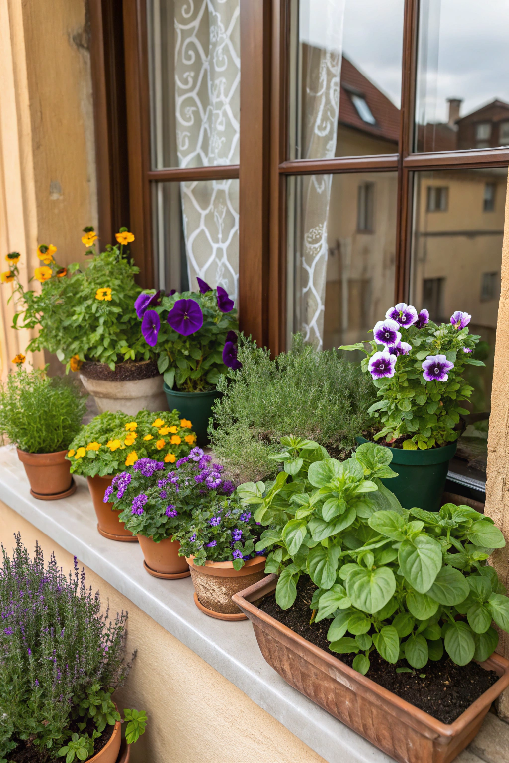 PinTransform your window sill into a lush garden oasis. Start by choosing small pots for herbs like basil, mint, or thyme—these add flavor and fragrance. Use colorful flowers like violets or succulents for a pop of color. Make certain each plant gets enough sunlight, and rotate them occasionally for even growth. This tiny garden not only beautifies your space but also freshens your cooking!