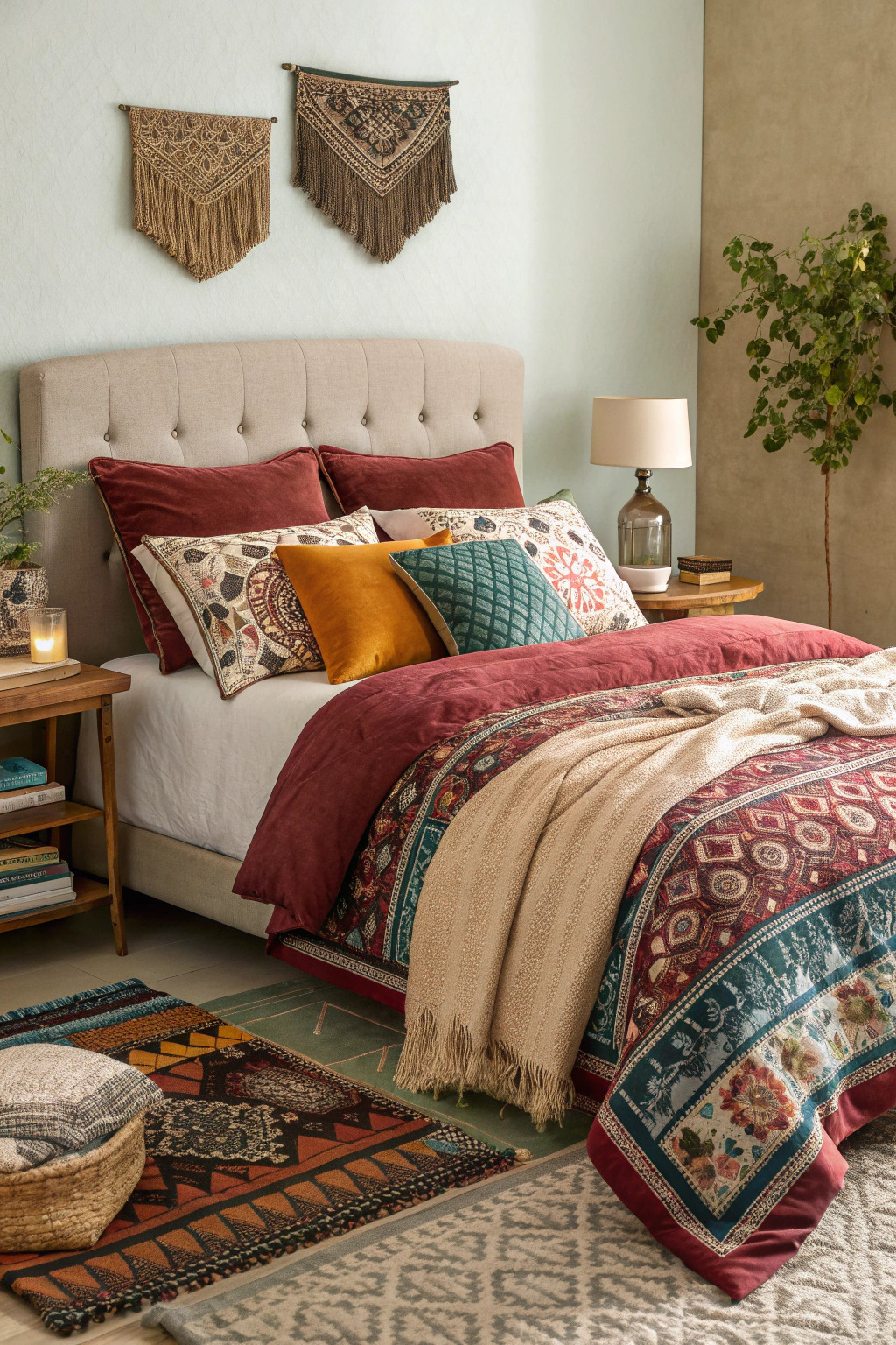 PinCombining different patterns sets a vibrant stage for layered textiles, which can transform your bedroom into a cozy haven. Opt for a mix of textures like velvet, linen, and cotton to create depth. Play with varying sizes and colors of throws and cushions, ensuring they complement but don't match exactly. This layering not only adds visual interest but also invites comfort into your space.