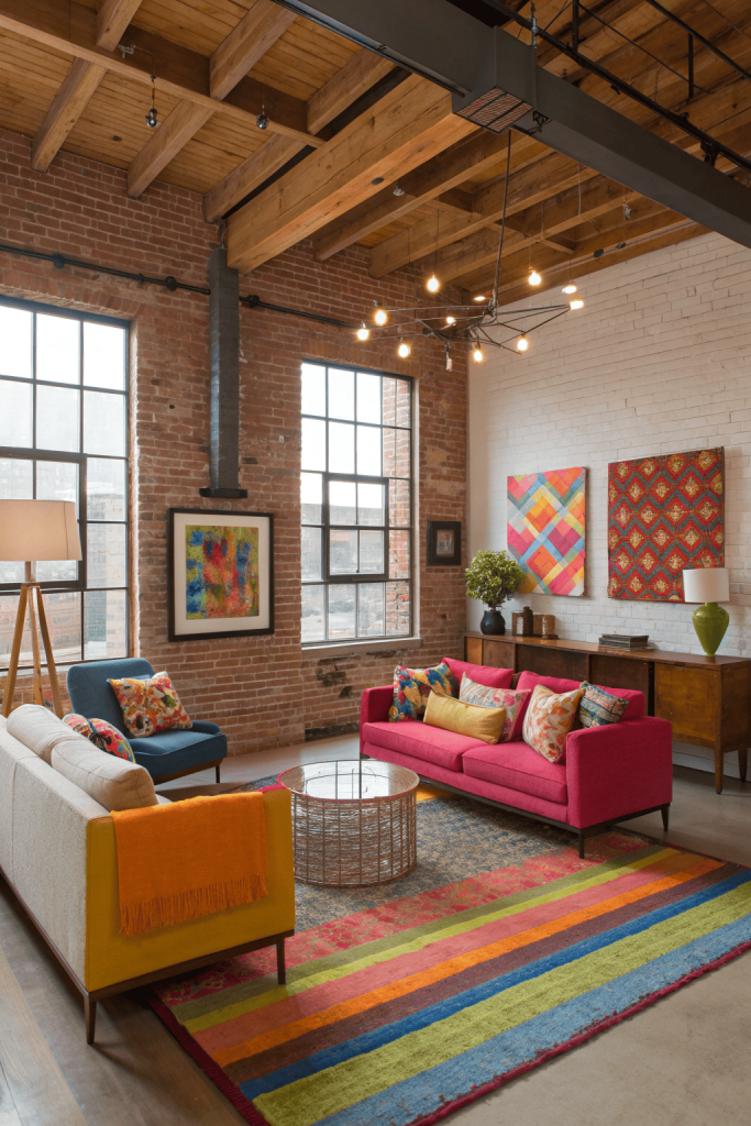 Blending the industrial elements of a chic loft with a vibrant color palette can elevate your family room to a whole new level. You'll energize the space and create an inviting atmosphere. Consider these vibrant touches: