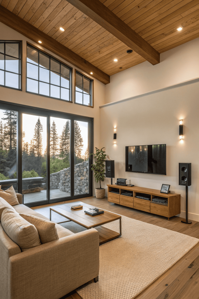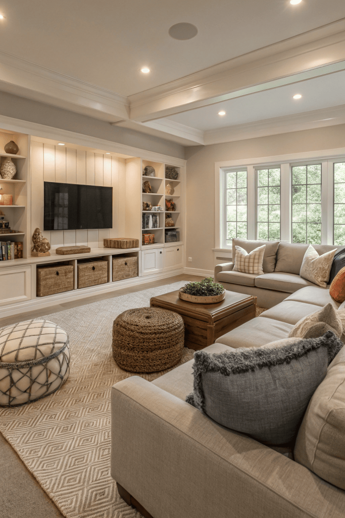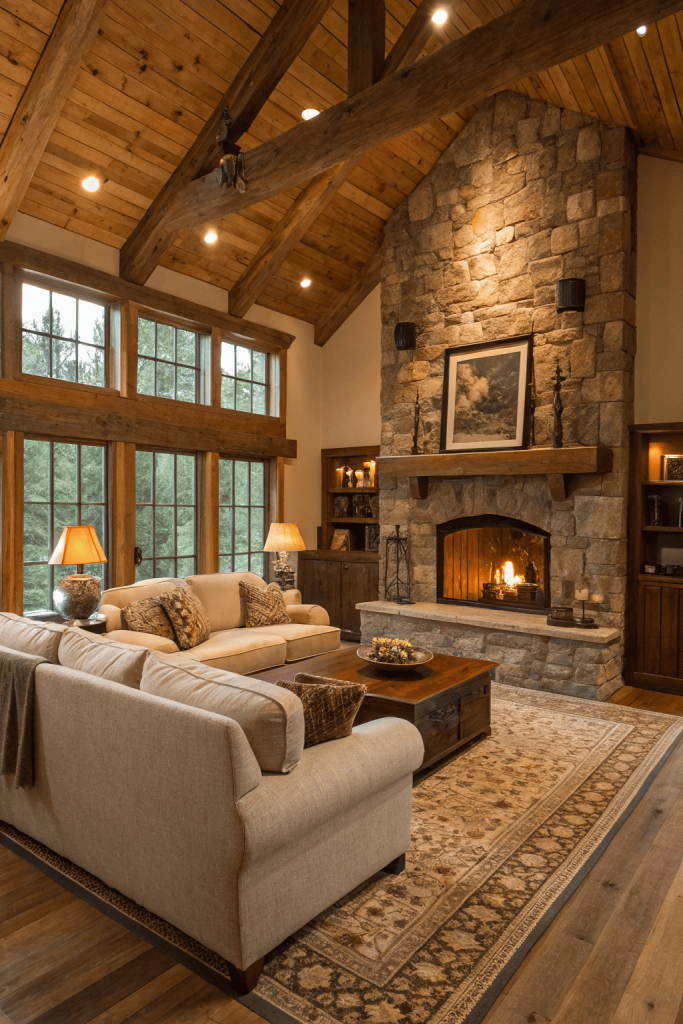 If you're looking to create a family room that feels warm and inviting, cozy rustic charm might be the perfect direction. You can achieve this by incorporating natural materials like reclaimed wood, stone accents, and soft textiles. Add a large, comfortable sofa, warm lighting, and personalized decor, such as family photos, to make the space feel truly lived-in and welcoming.