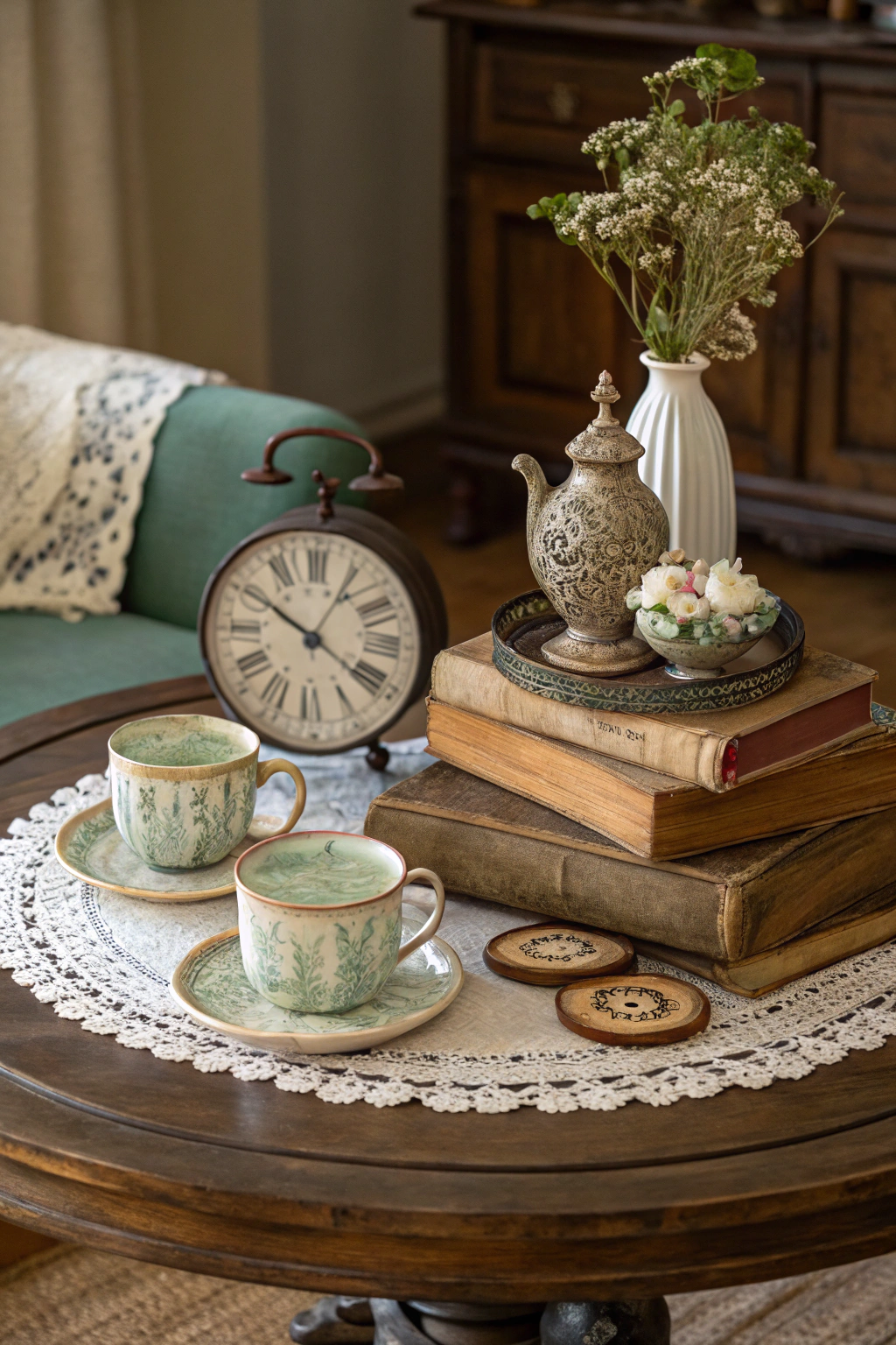 Mix textures like lace doilies and wood coasters to create a cozy, timeless ambiance.