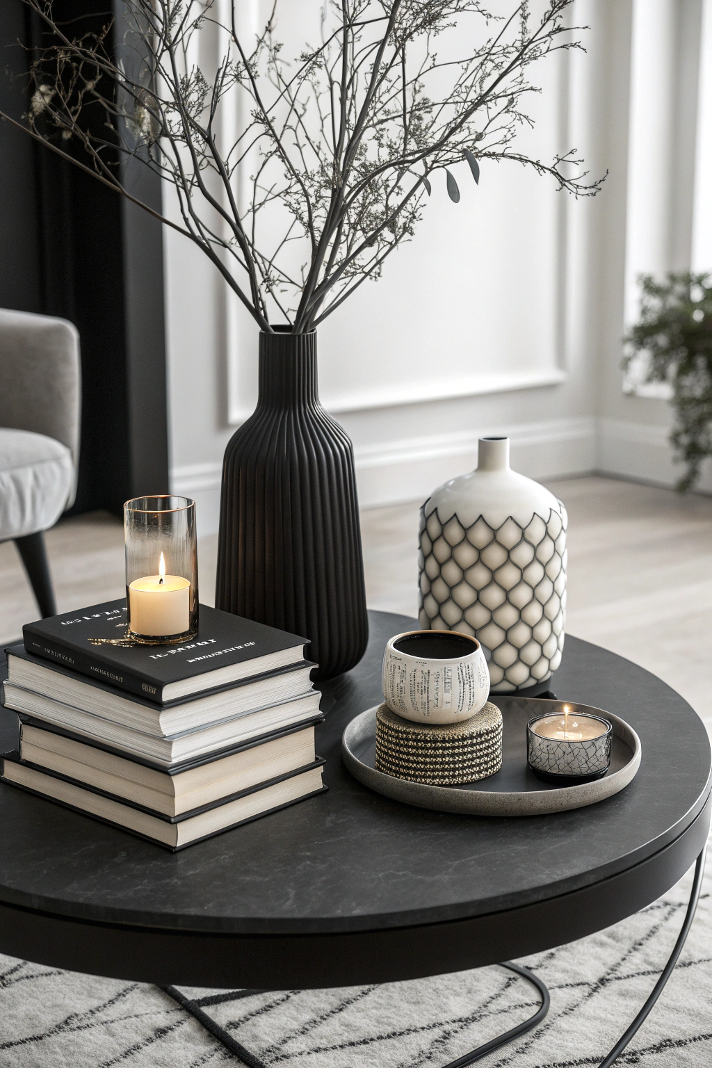PinWhile layered textures add depth, monochrome magic brings a sleek, cohesive look to your round coffee table. Choose a single color palette, like black and white, to create a striking visual impact.