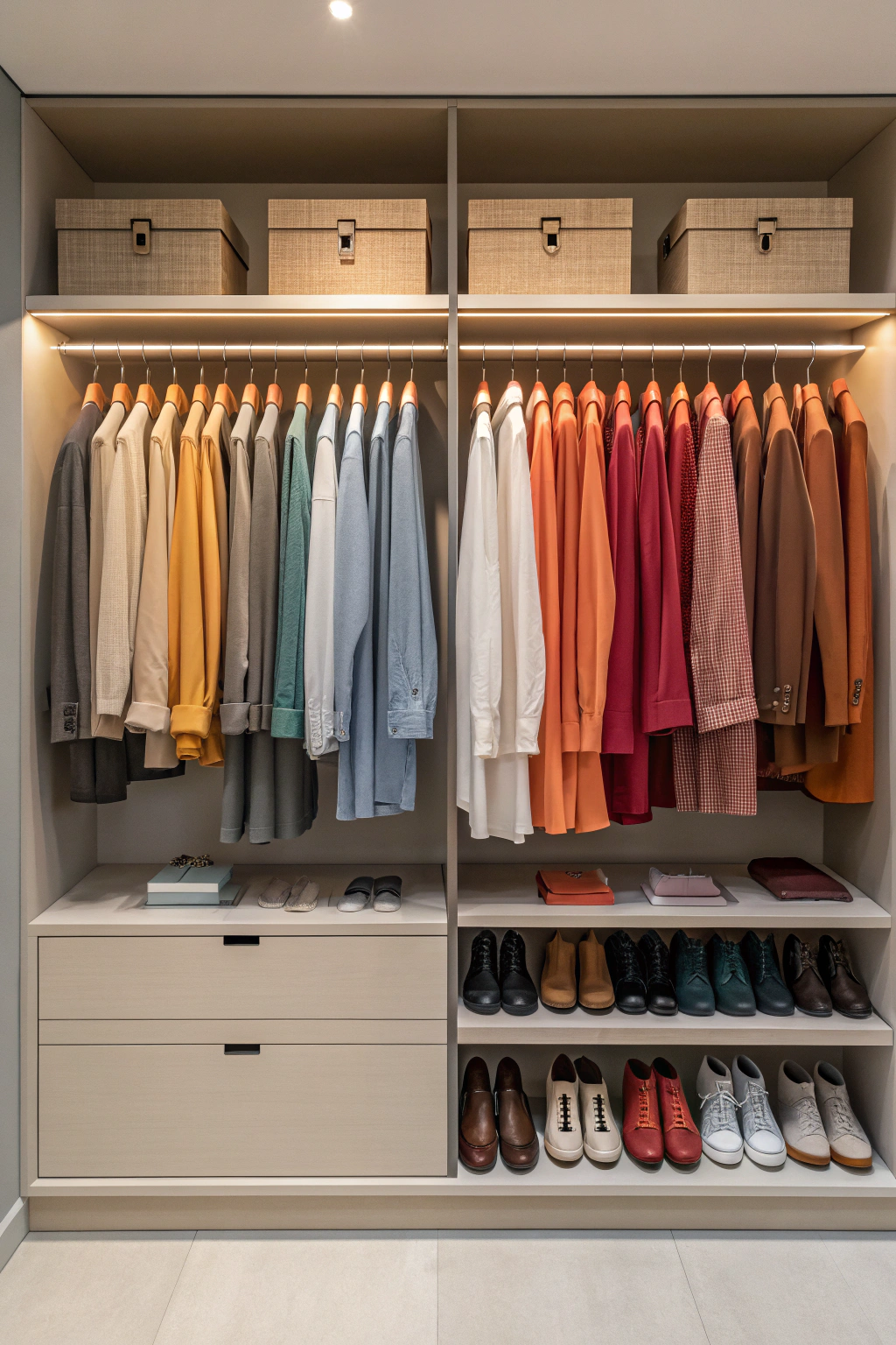 PinAfter you've created a seasonal rotation in your closet, consider implementing a color-coding system to further streamline your space. Organize your clothes by color, grouping similar shades together. This not only makes finding outfits easier but also creates an aesthetically pleasing look. You'll save time when getting dressed and enjoy a more organized closet that reflects your personal style.