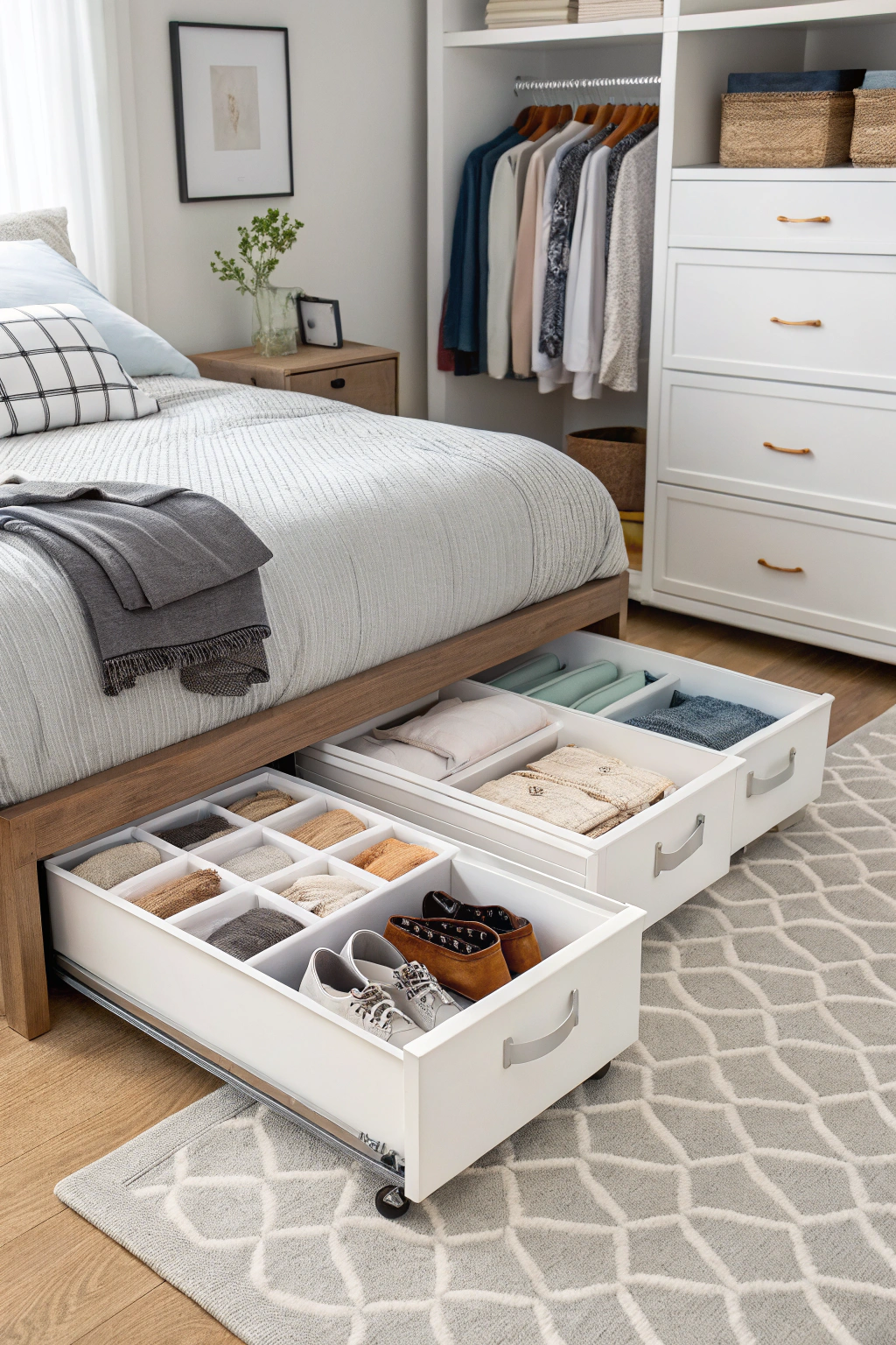 PinDrawer dividers help bring order to your closet, but don't forget about the often-overlooked space beneath your bed. Utilize this area by adding storage bins, vacuum-sealed bags, or drawers on wheels. You can store shoes, seasonal items, or extra bedding here, keeping your room neat. Just make certain everything's easy to access, maximizing both organization and available space in your small room.
