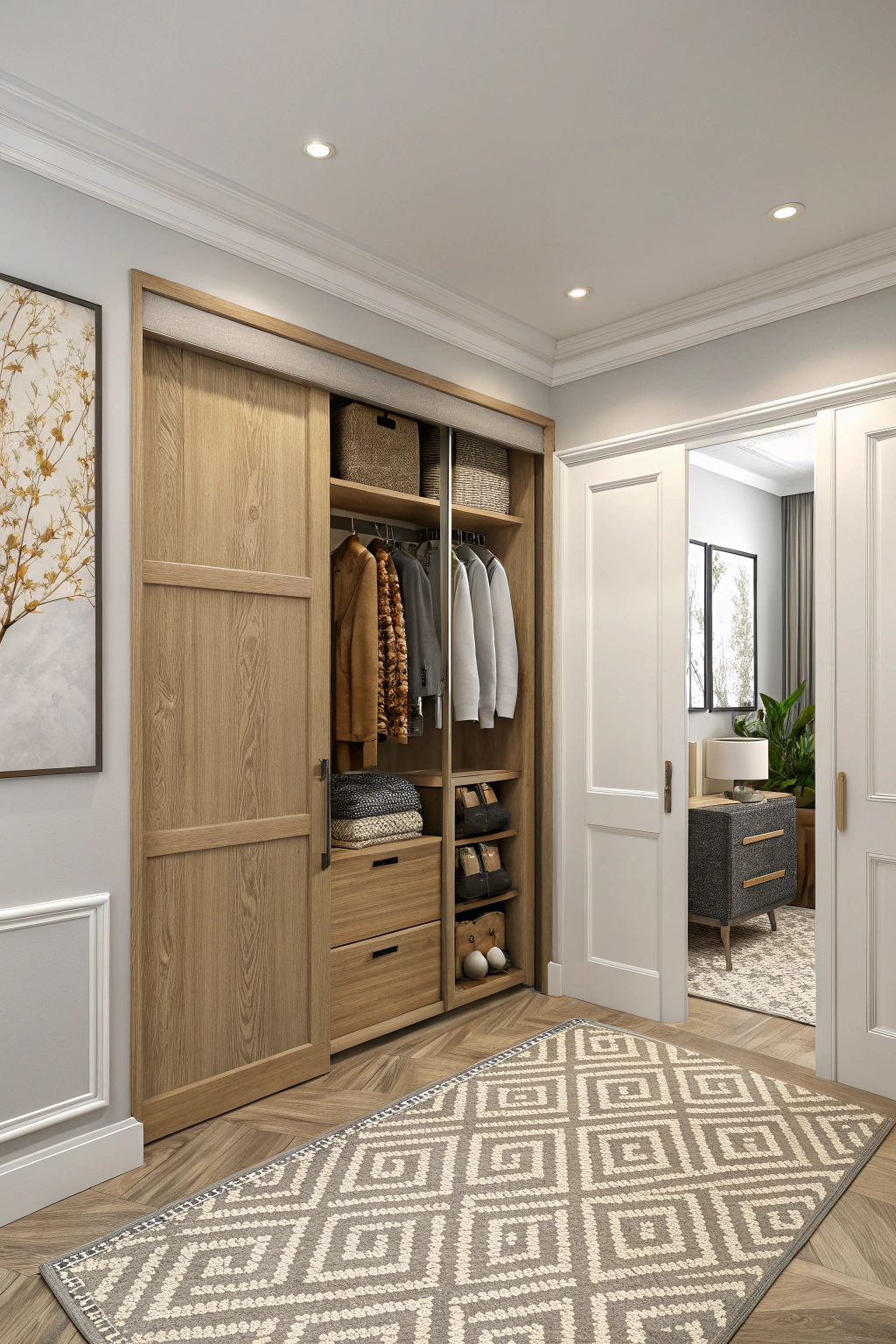PinWhen designing a closet in a small room, consider opting for sliding doors instead of traditional swinging ones. Sliding doors save space, allowing you to use every inch of the room efficiently. They're also stylish and can enhance the overall look of your closet. Plus, you won't have to worry about door clearance, making your room feel more open and functional.