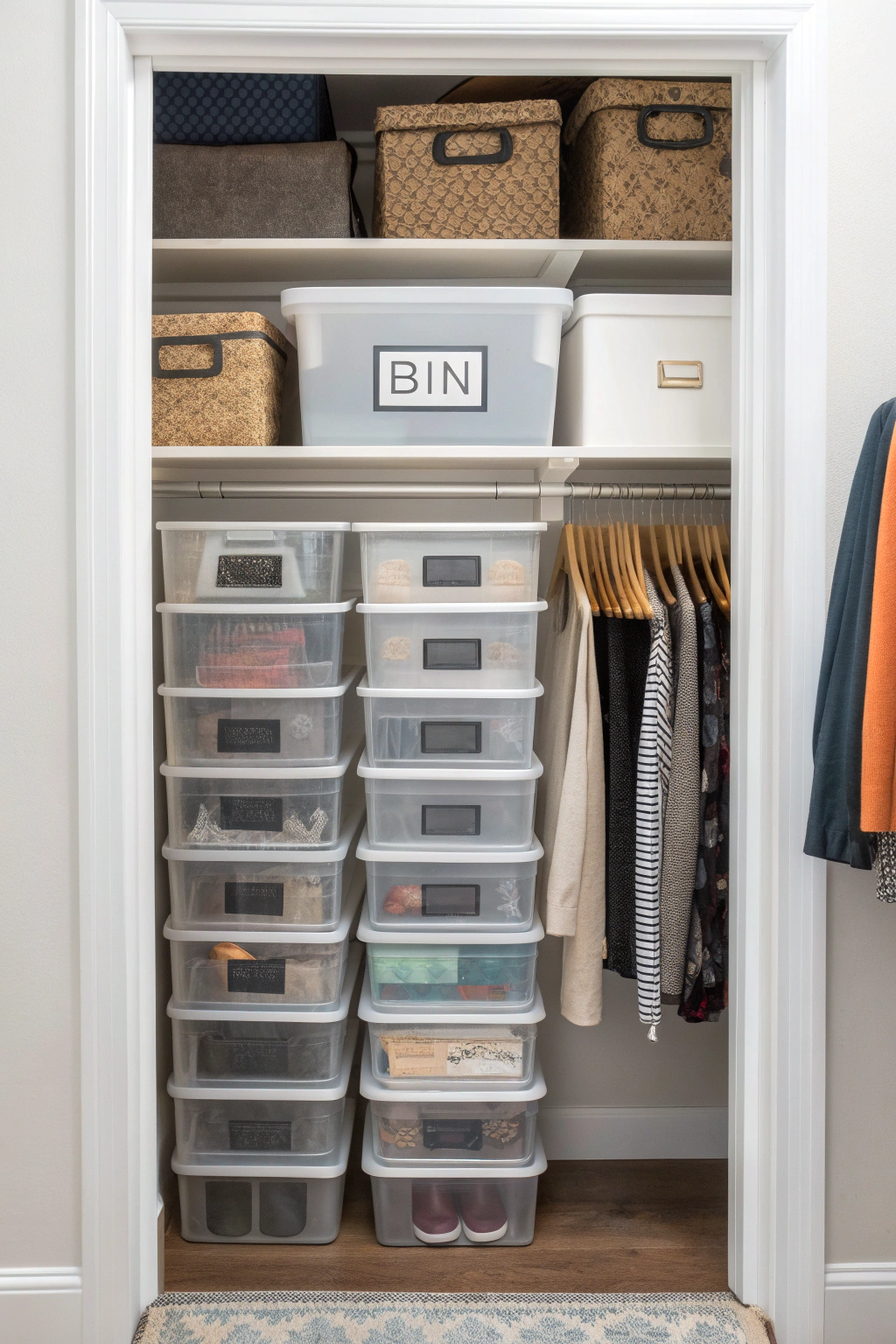 PinWhen it comes to maximizing your small closet, clear storage bins are a game changer. These bins let you see everything at a glance, which saves time when you're getting dressed. They stack easily, making the most of vertical space. Plus, you can use labels to keep everything organized. Choose various sizes to accommodate different items, ensuring your closet stays neat and functional.