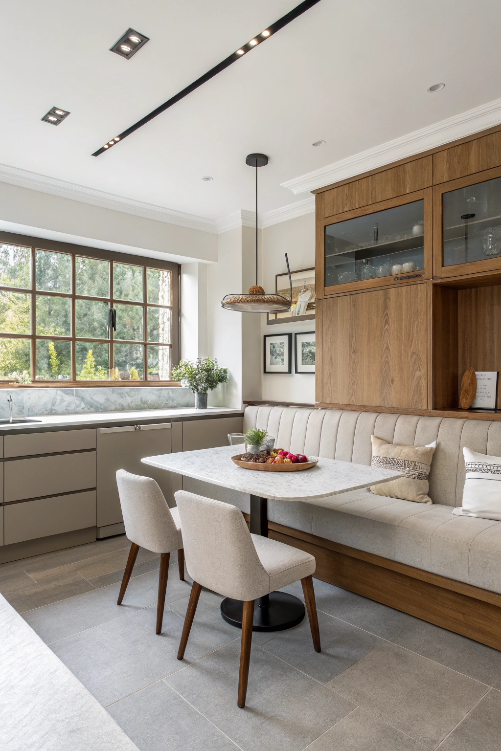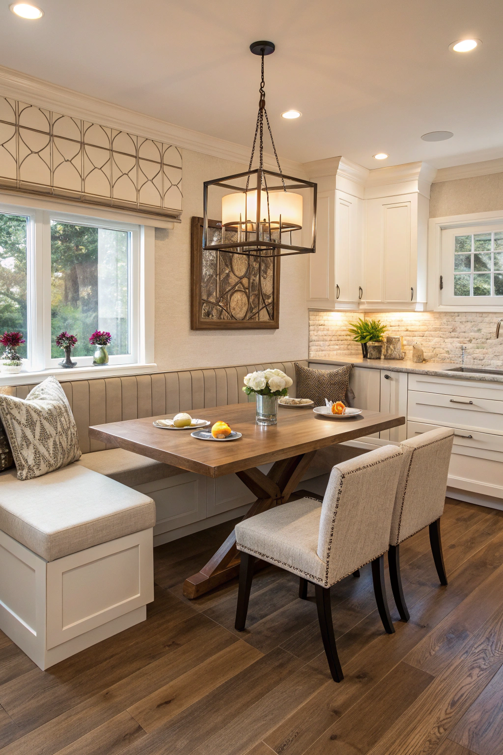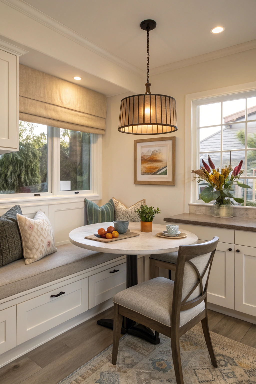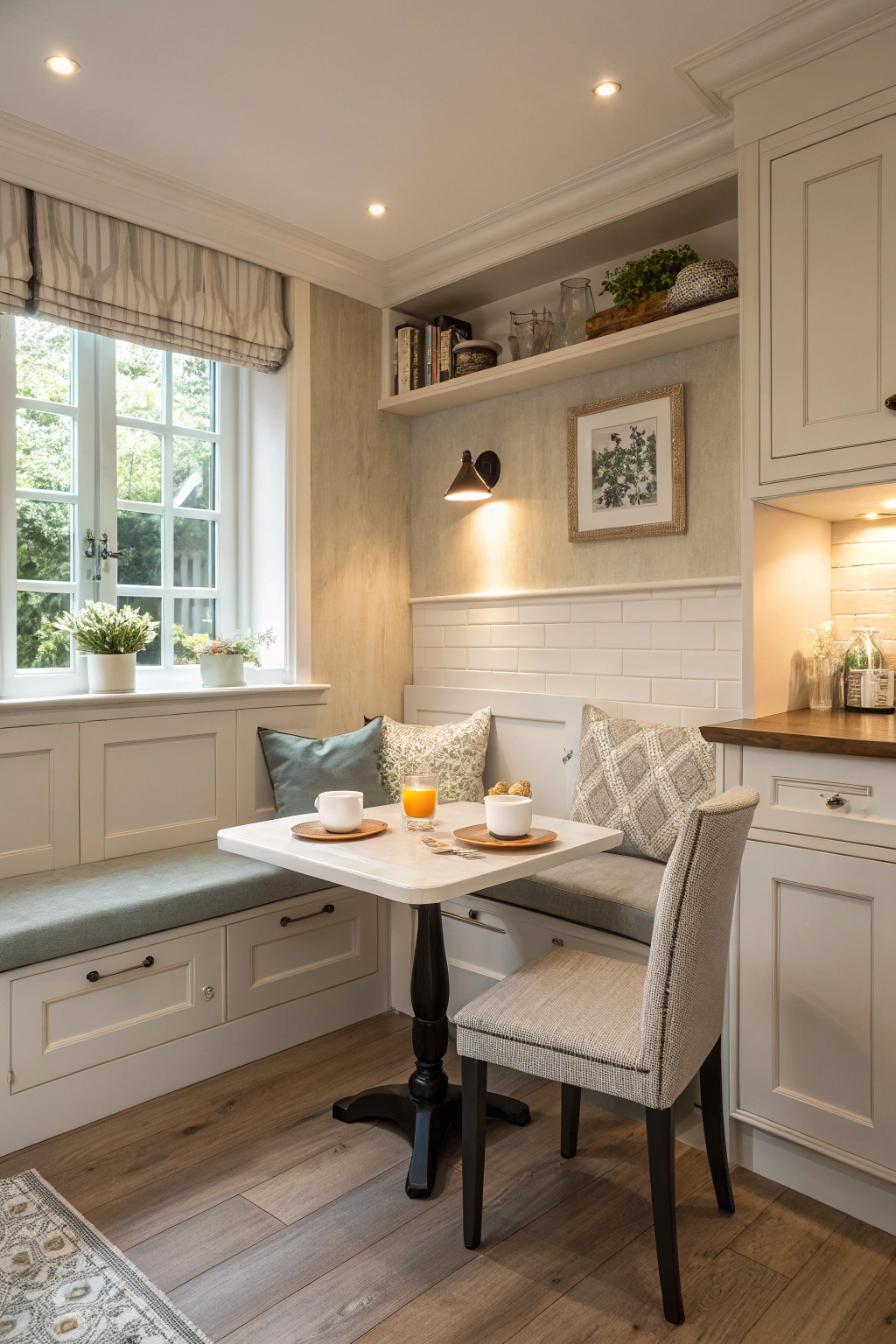 PinA cozy corner nook for two can transform your kitchen into an inviting dining area. By arranging a small table with built-in seating, you've created a perfect spot for intimate meals or morning coffee. Enhance the nook with cozy cushions and soft lighting to make it even more inviting. This functional design not only saves space but also fosters warm conversations and shared moments.