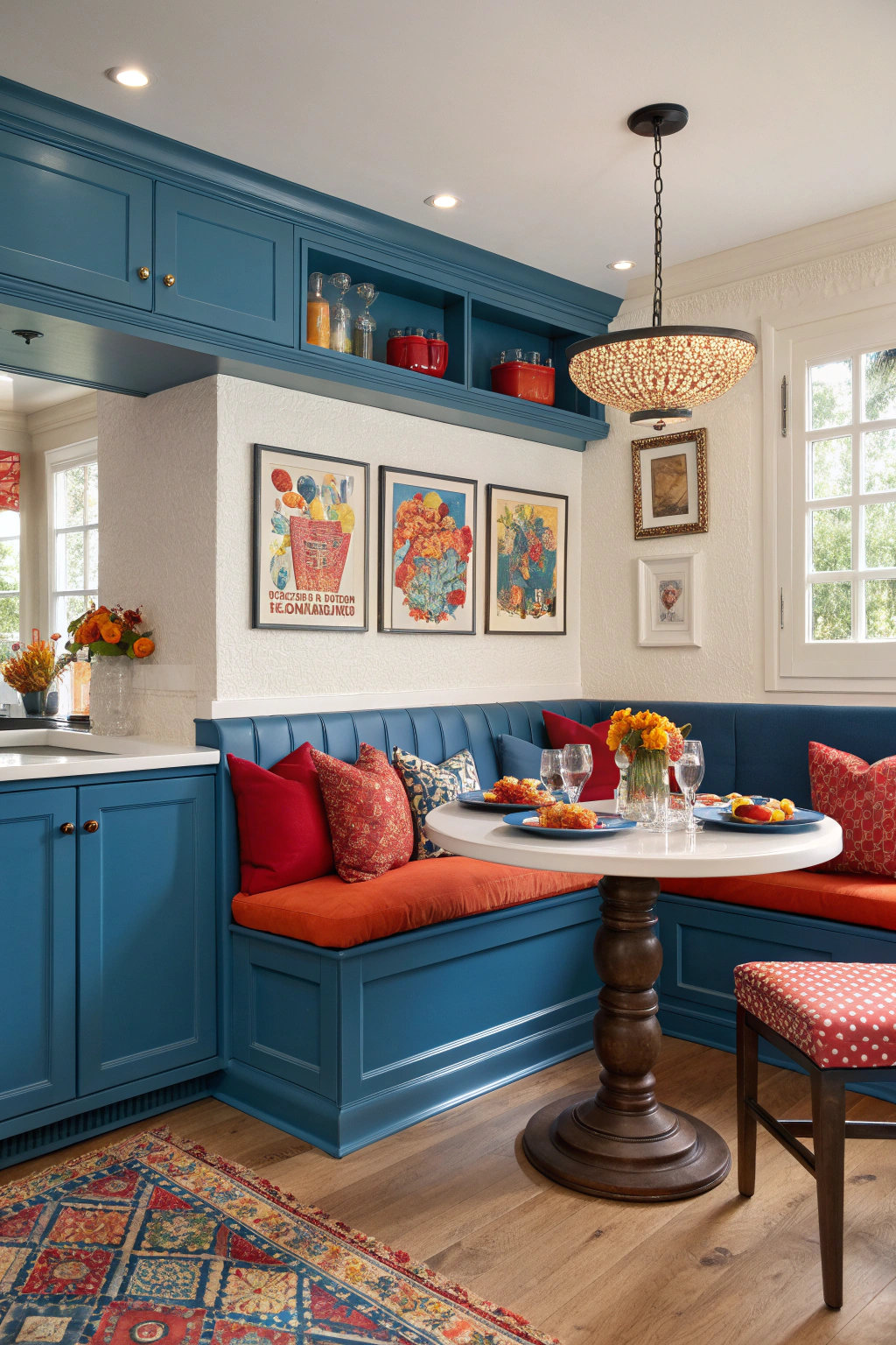 PinAdding bold accent colors to your kitchen banquette can elevate the space and create a vibrant atmosphere. Think vibrant cushions in rich blues or fiery reds to draw attention. You could also incorporate colorful tableware or artwork that harmonizes with your banquette. These pops of color can not only enhance your decor but also reflect your personality, making your kitchen feel more inviting.