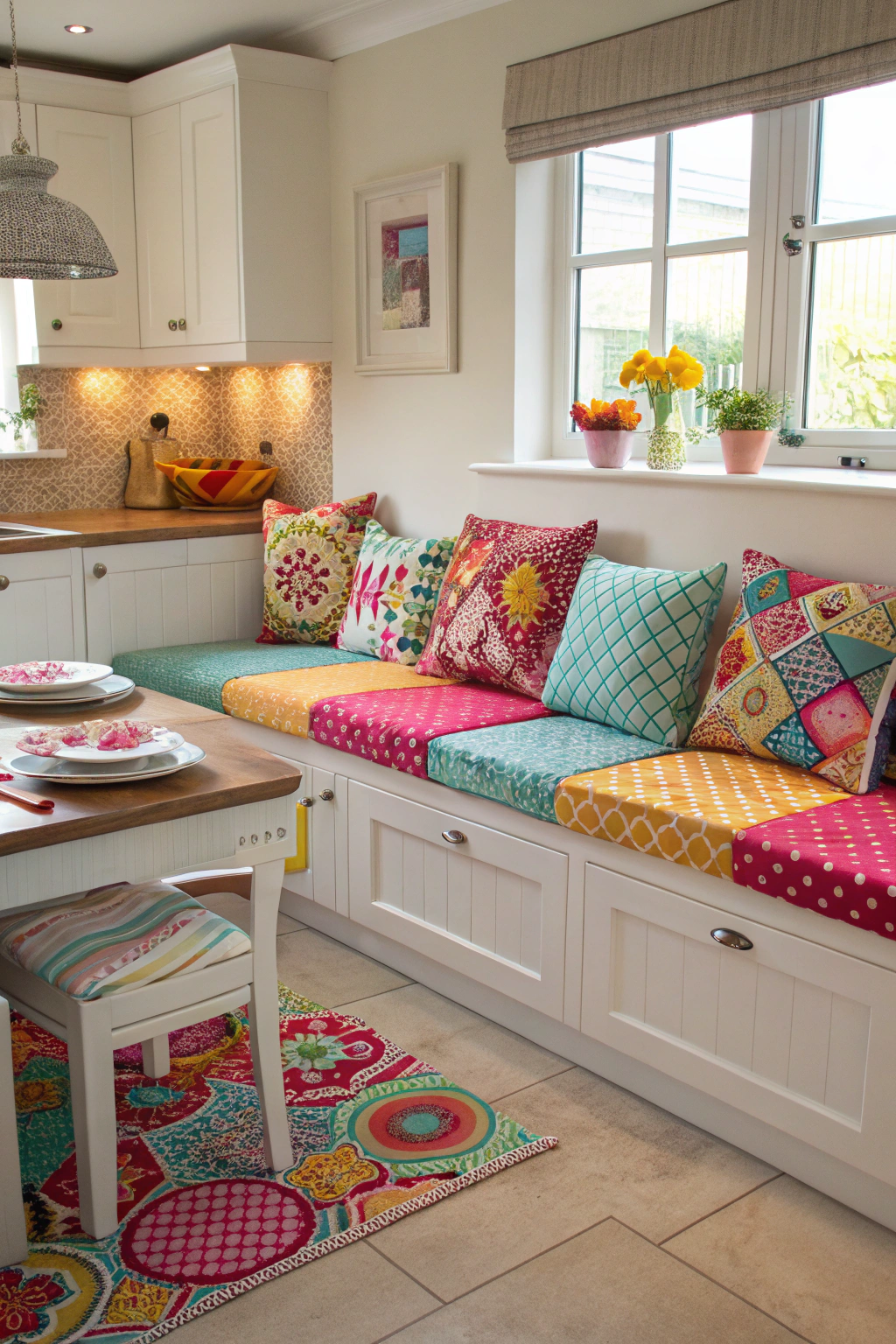 PinAdding multicolored cushions to your banquette seating can instantly elevate the kitchen's vibe, transforming it into a lively gathering spot. Choose vibrant patterns and contrasting colors to create visual interest and playfulness. Mix and match different sizes for added texture. These cushions not only enhance comfort but also allow you to express your personality, making your kitchen a warm and inviting space.