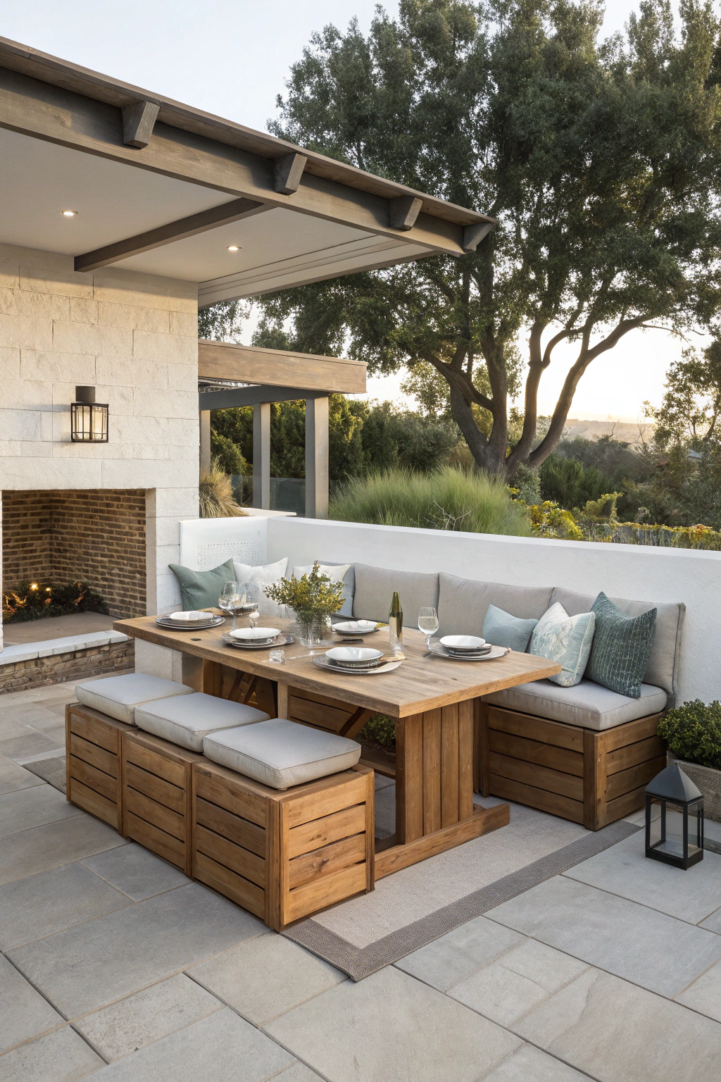 PinTransform your outdoor kitchen with a stunning banquette that seamlessly blends style and comfort. It's the perfect spot for family gatherings or entertaining friends. Choose durable materials to withstand the elements, and consider adding cushions for extra coziness.