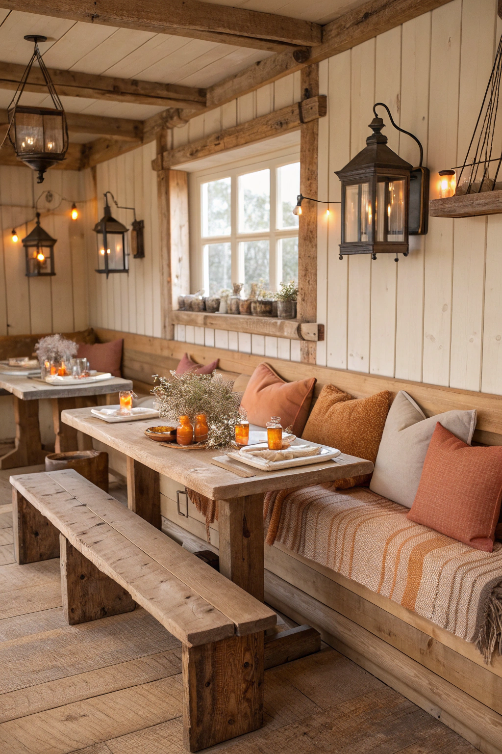 PinWhen you think of rustic farmhouse style, imagine warm, inviting spaces that blend comfort with simplicity. To achieve this look in your banquette seating, use weathered wood, soft textiles, and earthy colors. Incorporate cushions for added comfort, and consider wooden tables with a distressed finish. Adding vintage accents like mason jars or lanterns will enhance the cozy, welcoming atmosphere you desire.