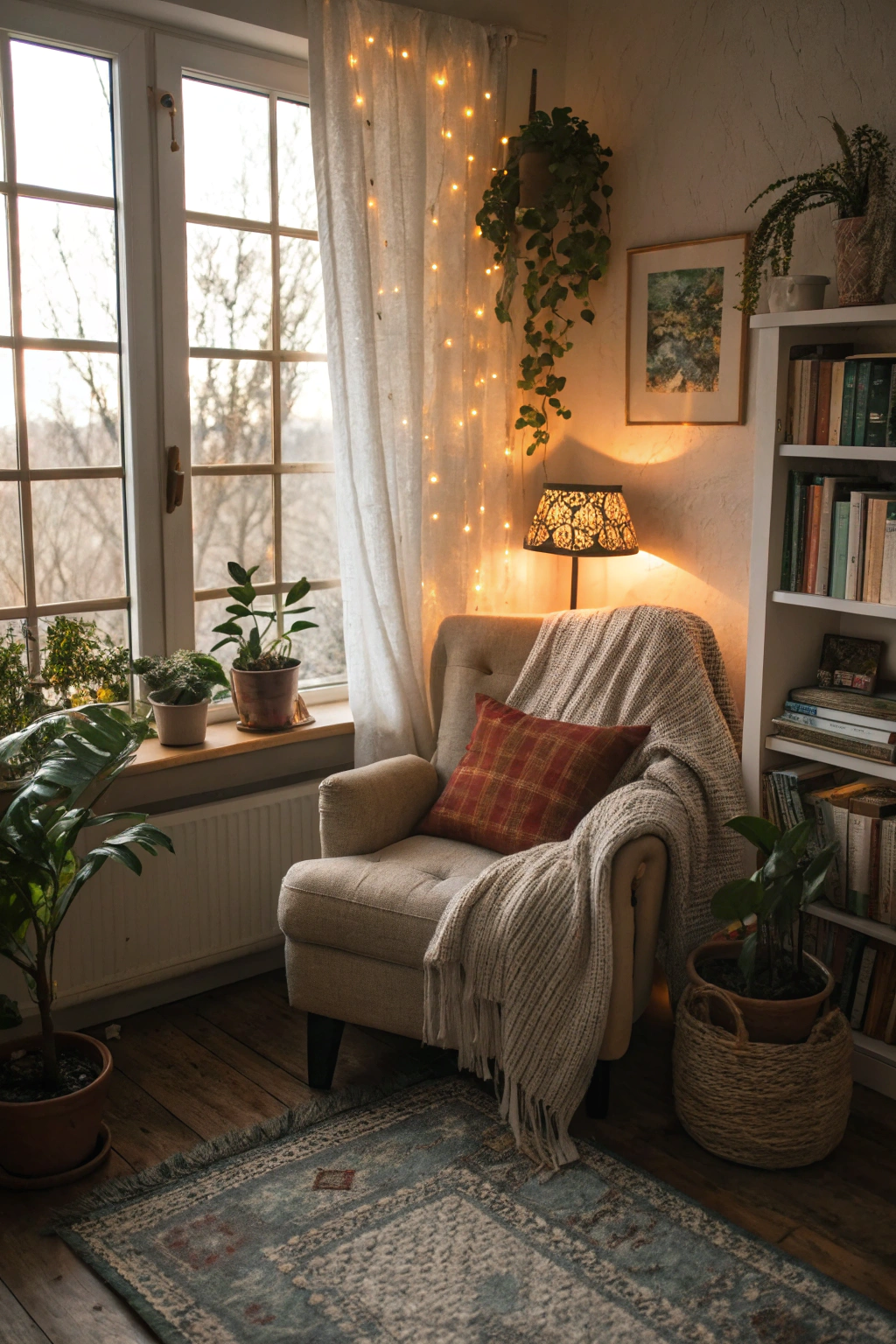 - Warm lighting: Use fairy lights or a vintage lamp.
