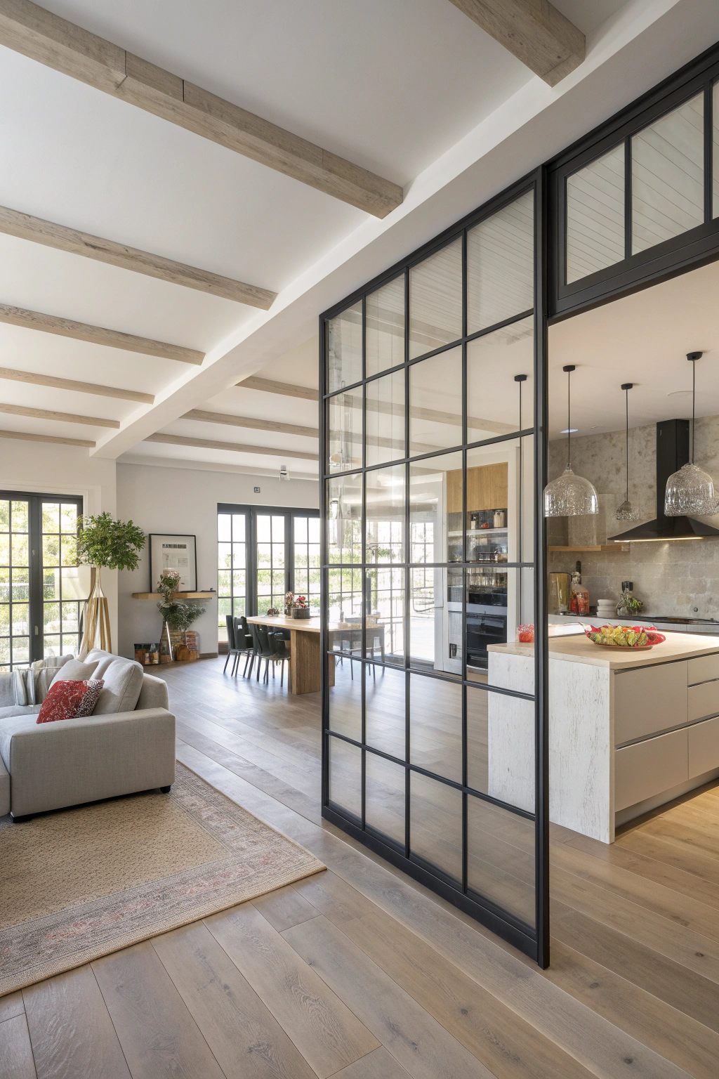 PinA sense of openness doesn't have to mean sacrificing privacy or separation in your open concept kitchen and living room. Glass partitions offer a stylish solution, allowing natural light to flow while creating distinct spaces. You can easily showcase your design while maintaining a functional boundary. Consider frosted or tinted glass for added privacy without losing that airy feel you desire.