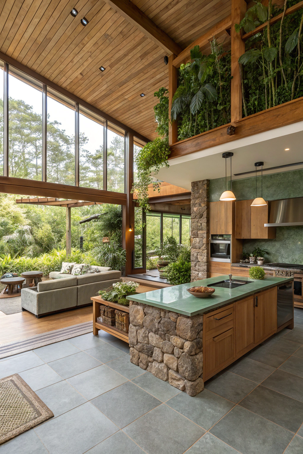 PinEmbracing nature-inspired elements in your open concept kitchen and living room can create a revitalizing and harmonious atmosphere. Incorporate materials like wood, stone, and bamboo to connect with the outdoors. Use a soothing color palette of greens and earthy tones. Add plants, herbs, or a vertical garden to enhance freshness. These touches will foster tranquility and make your space more inviting and alive.