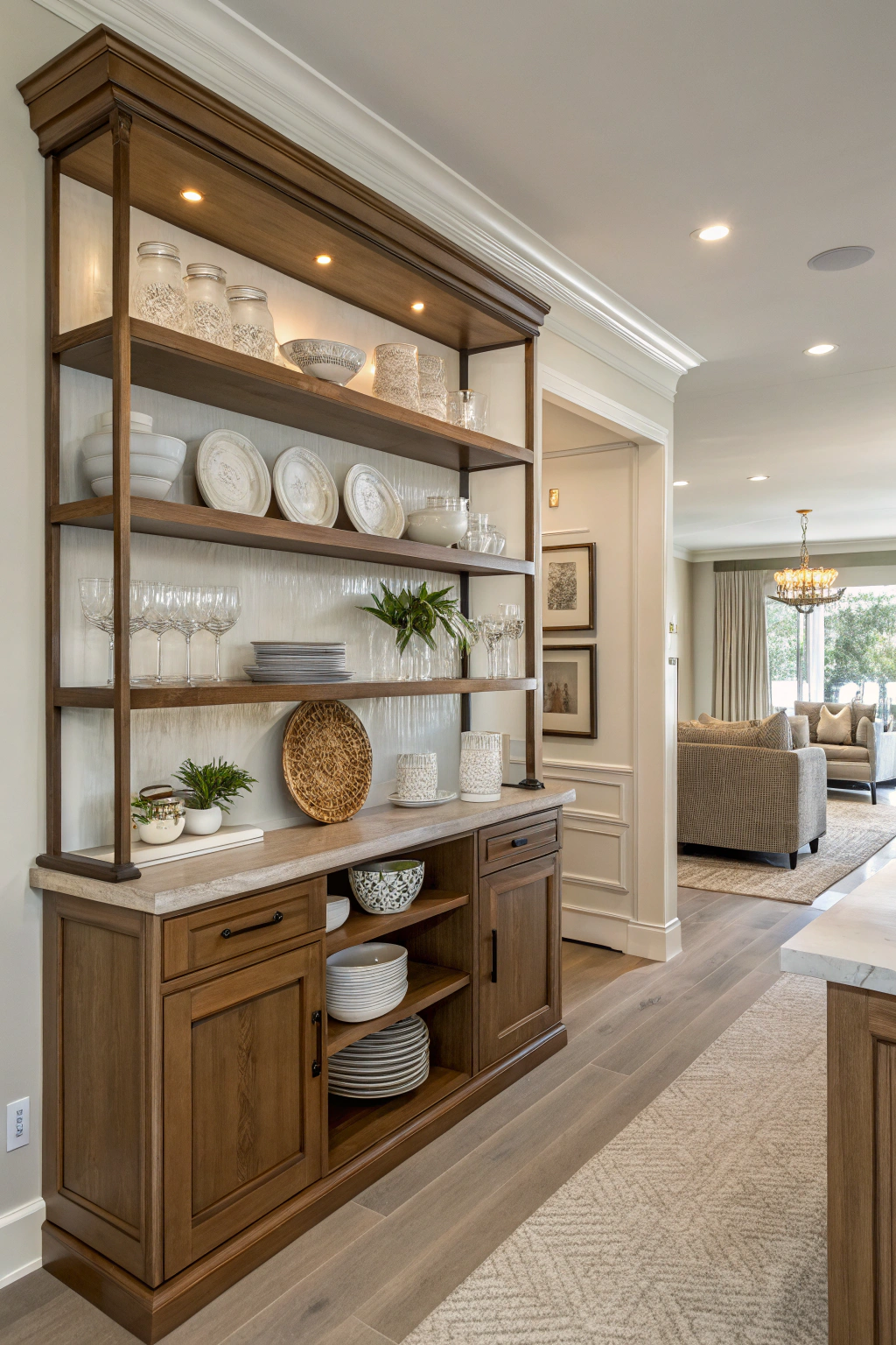 PinOpen shelving can bring a sense of elegance and sophistication to your open-concept kitchen and living room. You can showcase your favorite dinnerware, stylish glassware, and curated dΓ©cor, adding both personality and functionality. By choosing wood or metal finishes that complement your design, you'll create a cohesive look. Keep the shelves organized and aesthetically pleasing for a truly refined ambiance that impresses guests.