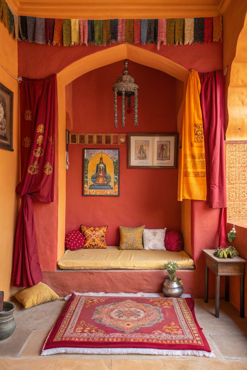 - Wall Colors: Choose warm tones like saffron or deep reds to create a sacred space.