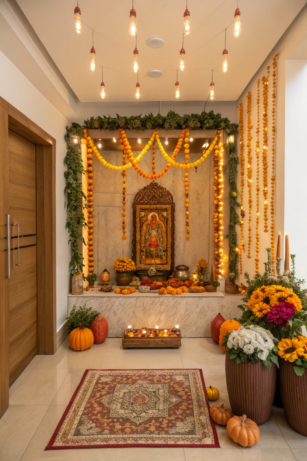 - Lighting: Use soft, warm lights to illuminate your mandir.