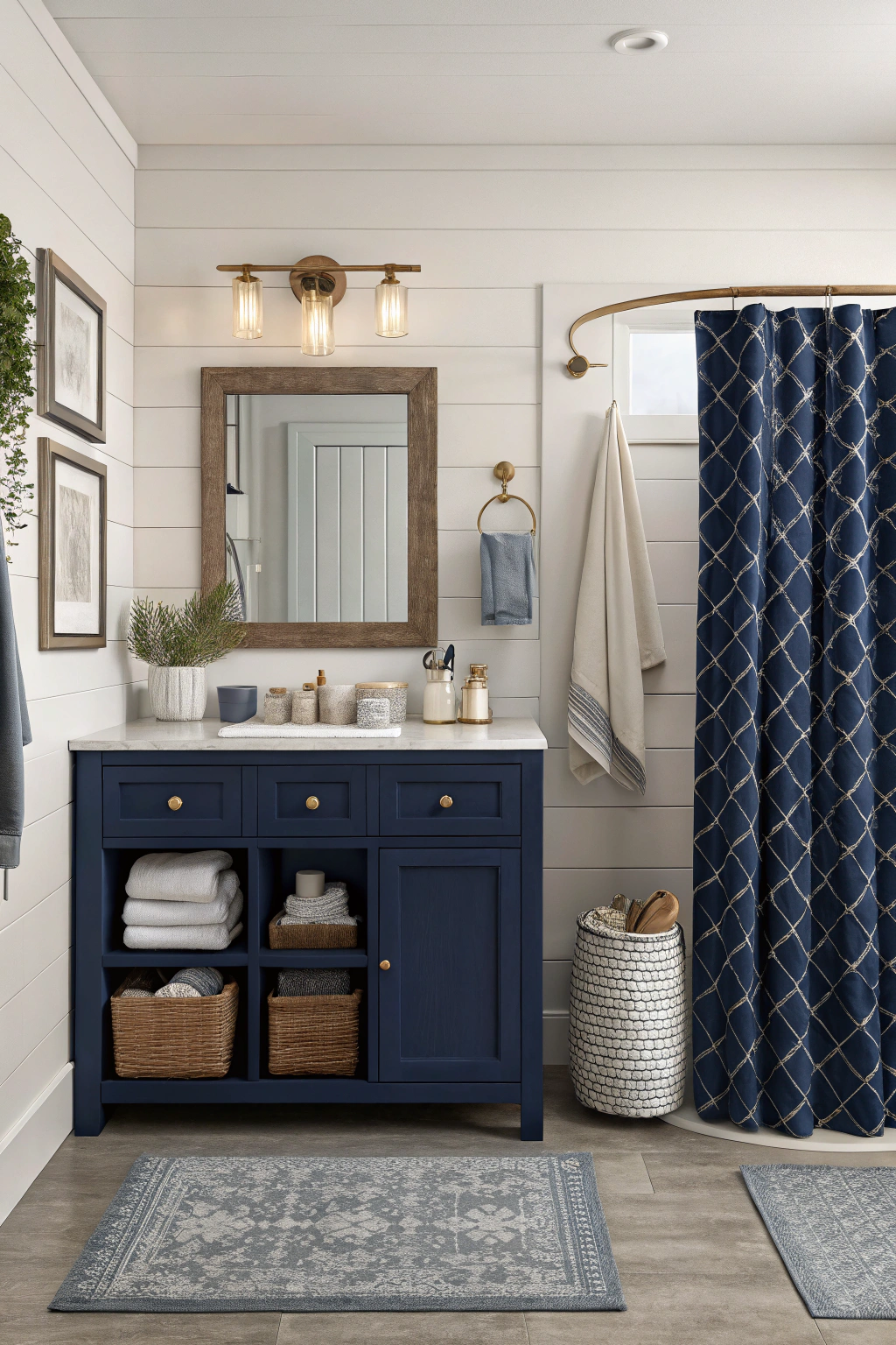 PinDeep navy accents can consistently elevate the aesthetic of your bathroom, bringing a touch of elegance and depth. You can incorporate deep navy through accessories like towels, shower curtains, or even a striking vanity. Pair them with soft neutrals or metallics for balance. This rich color not only adds sophistication but also creates a cozy vibe, making your bathroom feel inviting and stylish.
