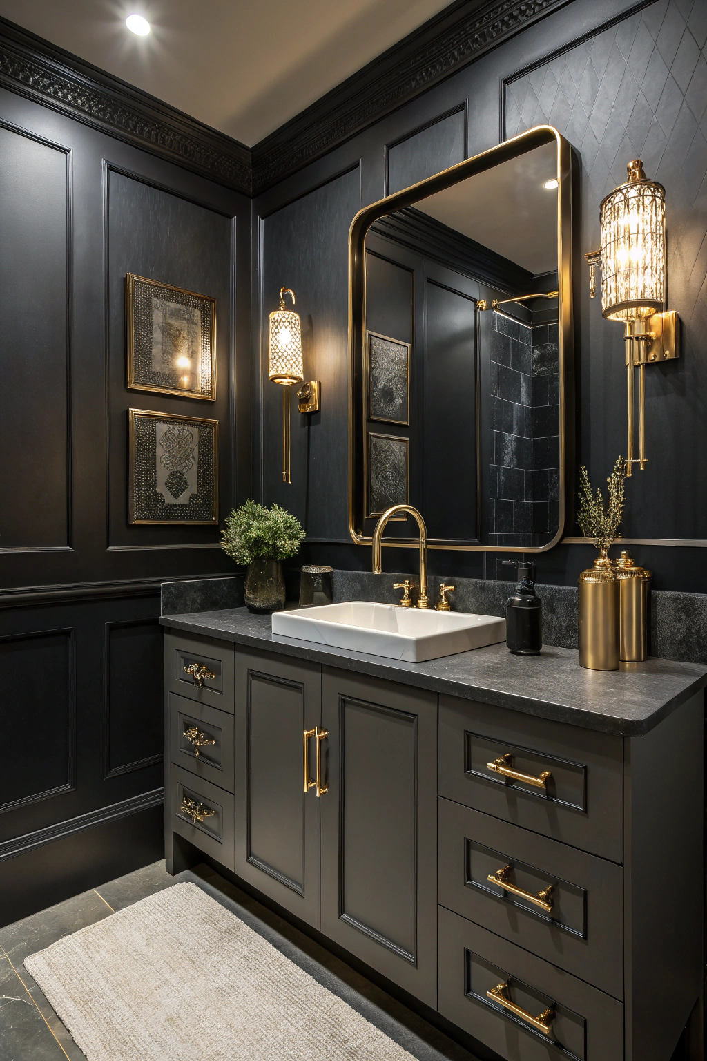 PinIncorporating moody metallic finishes can elevate your dark bathroom, adding a touch of glamour and intrigue. Consider a brushed brass or matte black faucet to create a striking contrast against deep hues. You might also add metallic accents through light fixtures, mirrors, or decorative hardware. These elements reflect light beautifully, enhancing the overall ambiance while making your space feel both modern and luxurious.