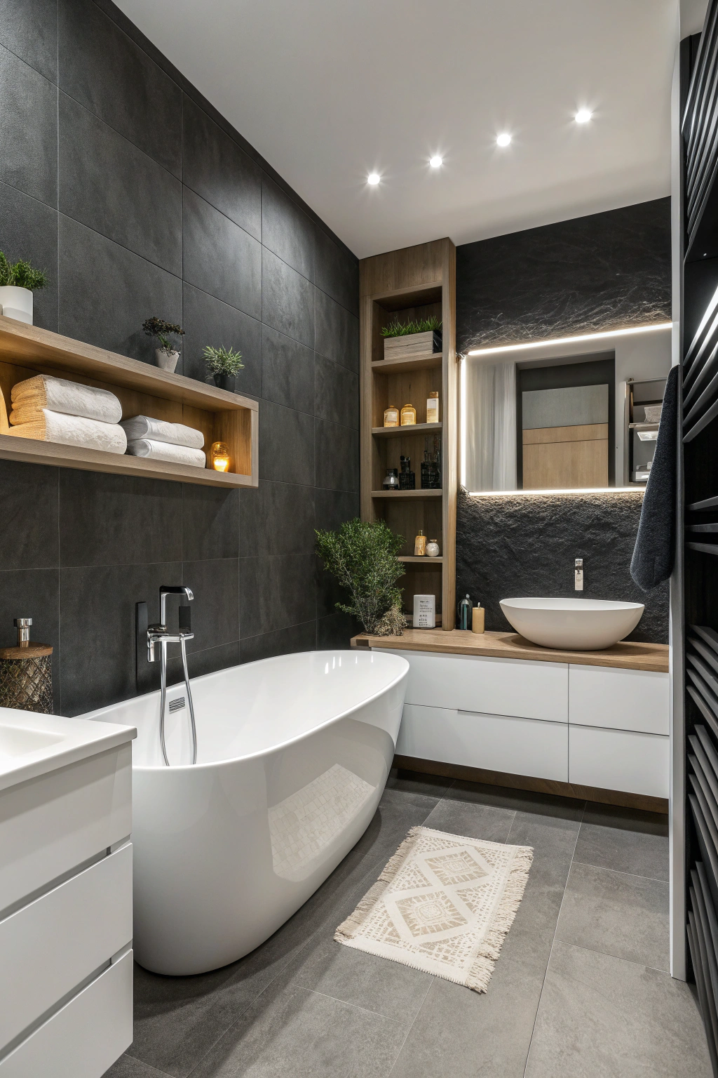 PinIncorporating white elements into your dark bathroom design can dramatically enhance the overall look and feel. White fixtures, like a sleek tub or a modern sink, can create striking focal points against darker hues. Consider white cabinetry or floating shelves to add brightness and balance. Even small accents, like white towels or soap dishes, can lighten up the space effectively.
