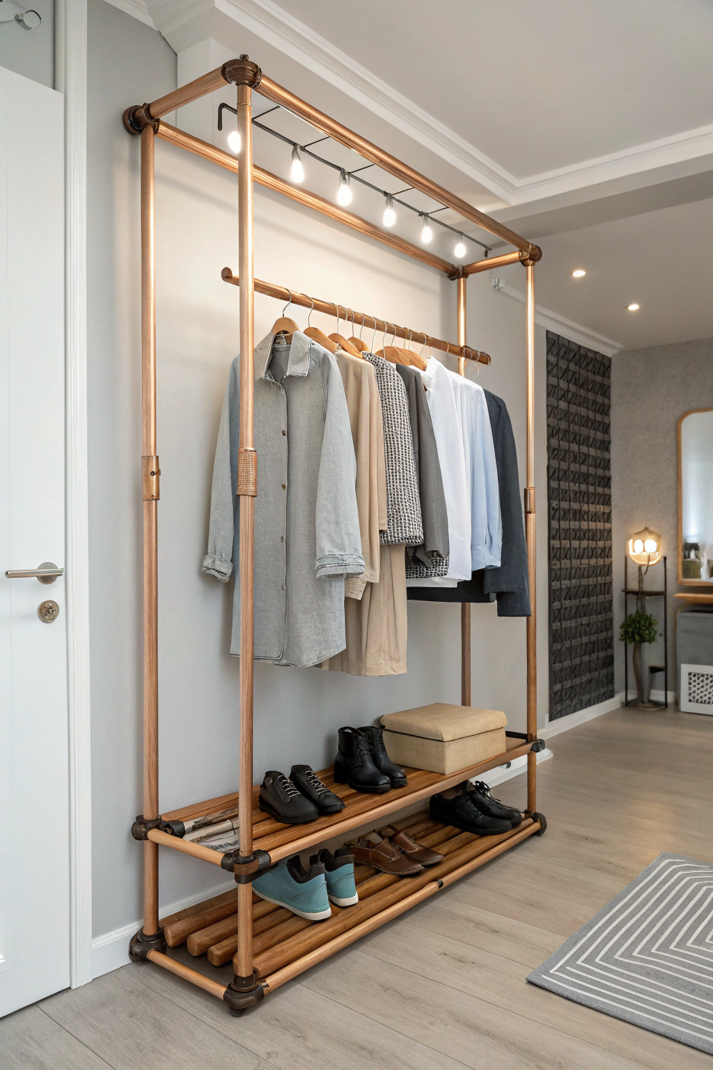 PinCreating a DIY clothing rack can elevate both the functionality and aesthetic of your dressing room. You can use inexpensive materials like wood, copper pipes, or even an old ladder. Simply cut your materials to size, assemble them, and then paint or stain them to fit your style. This customizable solution not only organizes your clothes but also adds a trendy touch to your space.