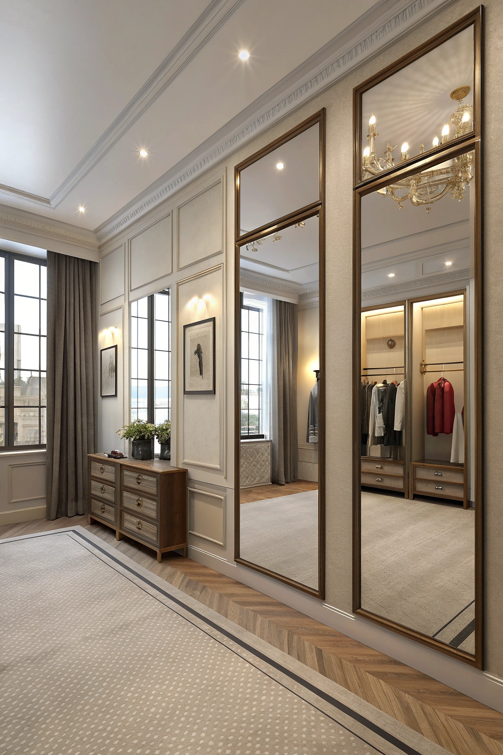 PinIncorporating full-length mirrors into your dressing room not only enhances functionality but also creates an illusion of more space. You'll appreciate how they reflect light and help you visualize outfits from head to toe. Consider these tips: