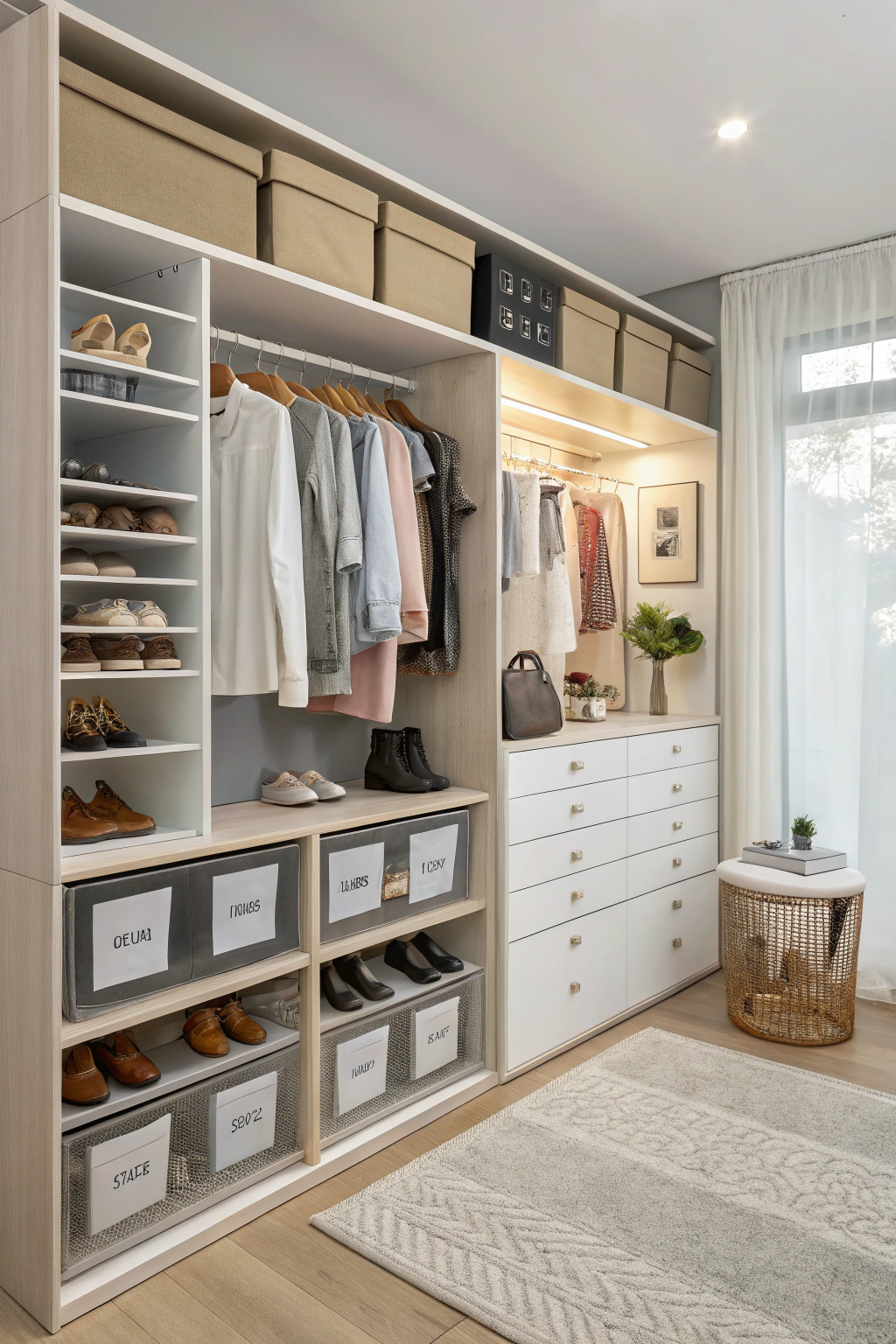 PinMaximizing your dressing room's efficiency doesn't stop at multi-functional furniture; innovative closet dividers can take your organization to the next level. Use adjustable dividers to create customizable sections for shoes, bags, and clothing. Try labeled bins or transparent dividers to easily find items. With these clever tools, you'll declutter and streamline your space, making getting dressed a breeze every day.