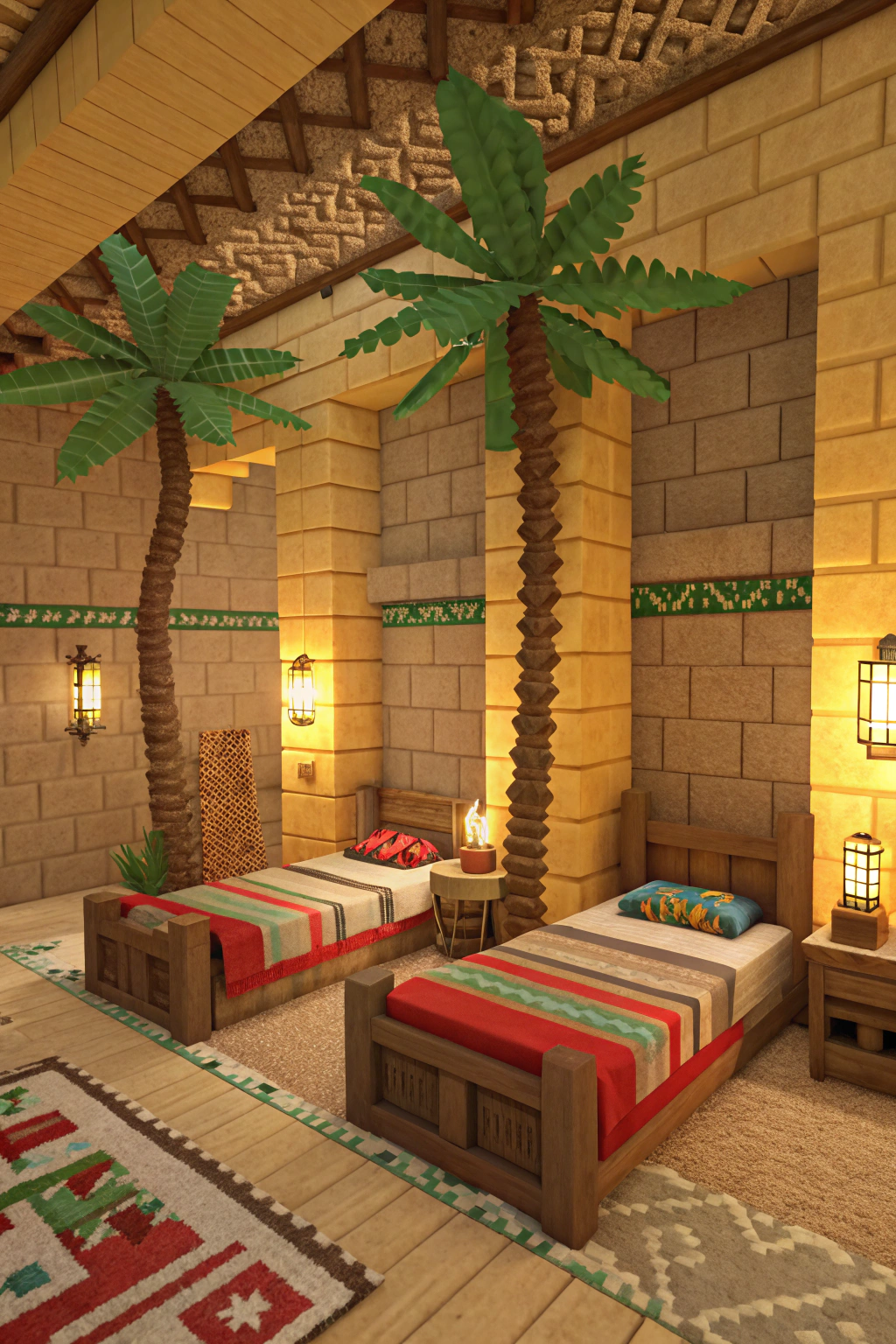 PinCreating a Desert Oasis Bedroom in Minecraft transports you to a serene getaway inspired by the beauty of sandy landscapes and palm-filled retreats. Use warm colors like yellows and browns for walls, and add sand blocks and sandstone for a natural feel. Include palm trees made from saplings, cozy beds with colorful wool, and lanterns for a magical ambiance, ensuring your space feels inviting and restful.