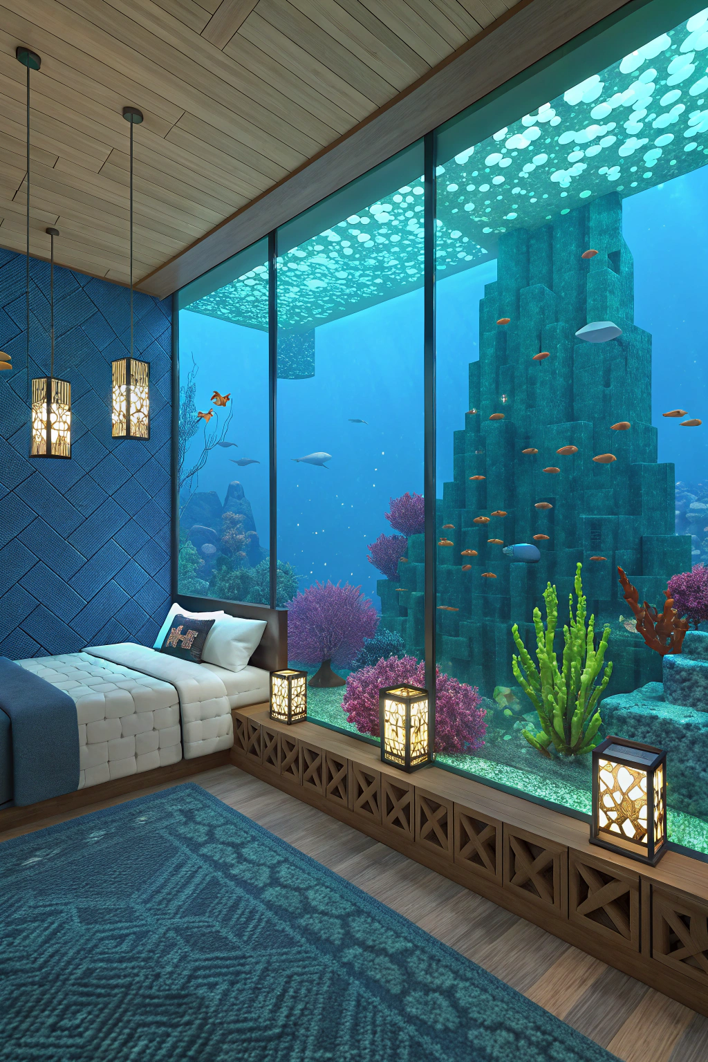 PinTransform your Minecraft bedroom into an underwater paradise, where the ocean floor feels vibrant and alive. Use blue, cyan, and green blocks to create flowing water walls. Add coral and vibrant sea plants to decorate, and use glass for a panoramic view of your aquatic surroundings. Don't forget to include lanterns for lighting, mimicking the shimmering reflections found below the waves.
