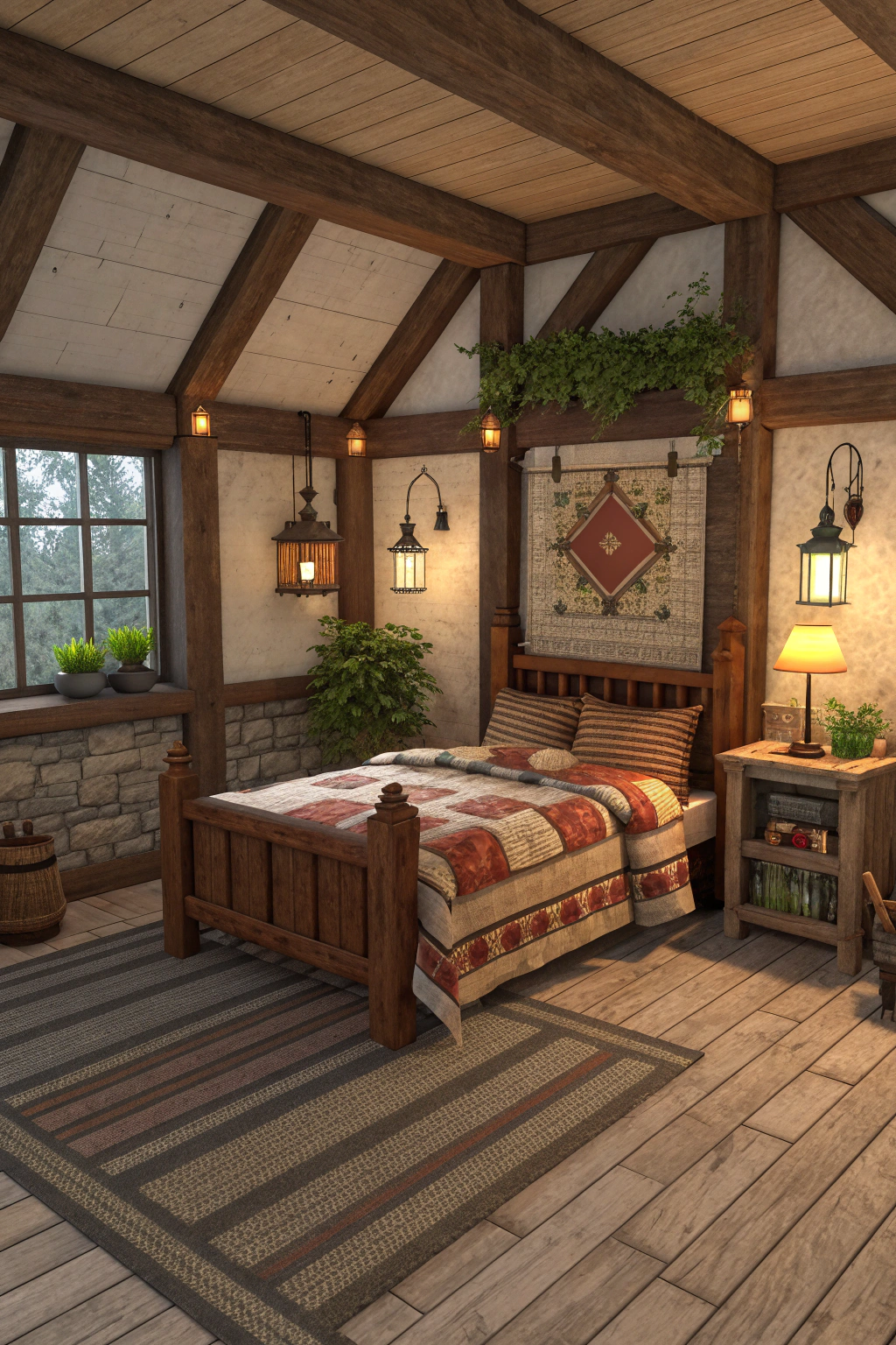 PinWood beams and warm colors define the rustic farmhouse style, giving your Minecraft bedroom a cozy, inviting feel. To enhance this charm, consider adding: