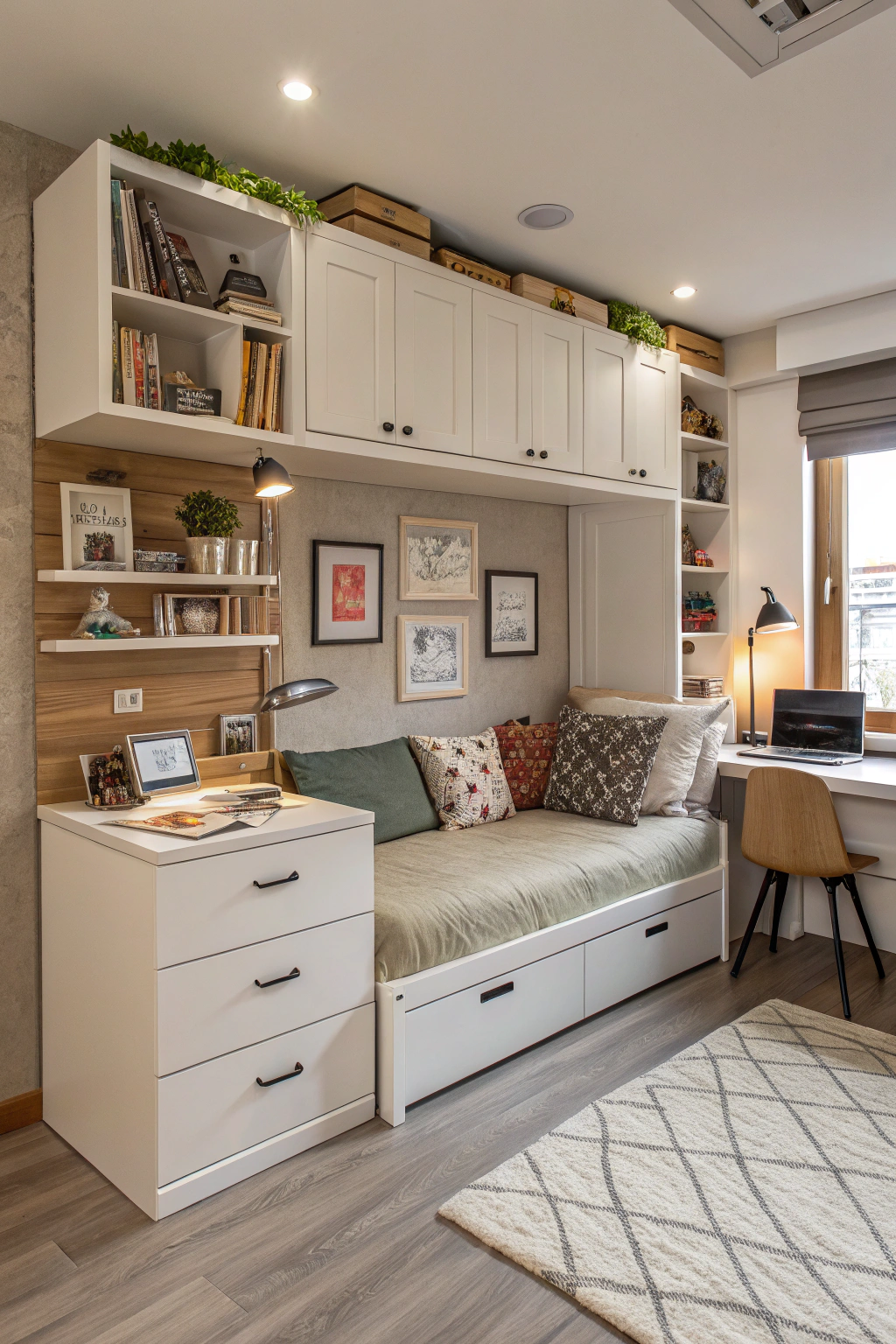 PinIncorporating multi-functional furniture into your small bedroom can further optimize the space created by a floating arrangement. Consider a bed with built-in drawers for storage or a desk that transforms into a bedside table. A loveseat sofa bed offers extra seating and sleeping space. These versatile pieces help maximize your layout while ensuring your room remains stylish and clutter-free.