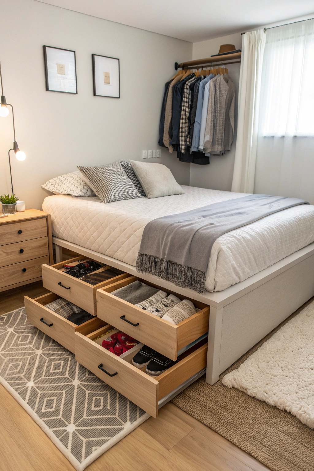 PinWhile you might think a small bedroom limits your storage options, a platform bed with drawers can transform your space efficiently. These beds provide hidden storage beneath your mattress, perfect for stashing away clothes, bedding, or extra shoes. By utilizing this ingenious design, you can keep your bedroom organized and visually appealing, maximizing both storage and floor space without sacrificing aesthetics.