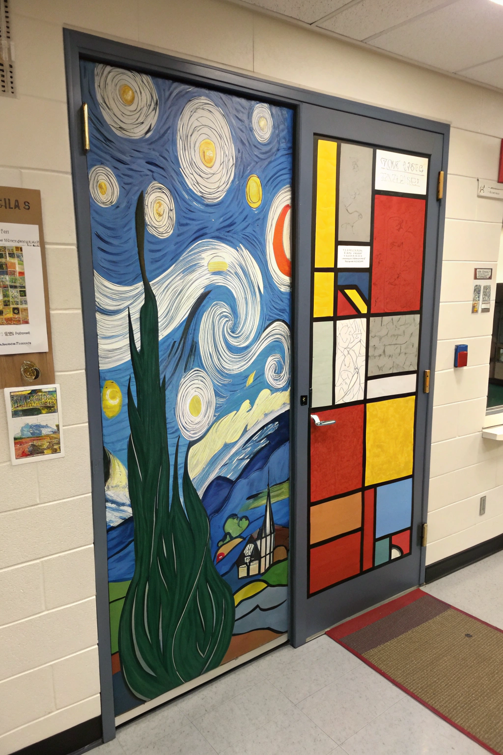 PinEver wondered how incorporating famous artists' styles into your classroom door decor can inspire creativity? Imagine a door that mimics Van Gogh's swirling skies or Mondrian's geometric precision. You'll engage students with vibrant colors and bold patterns, sparking curiosity about art history.