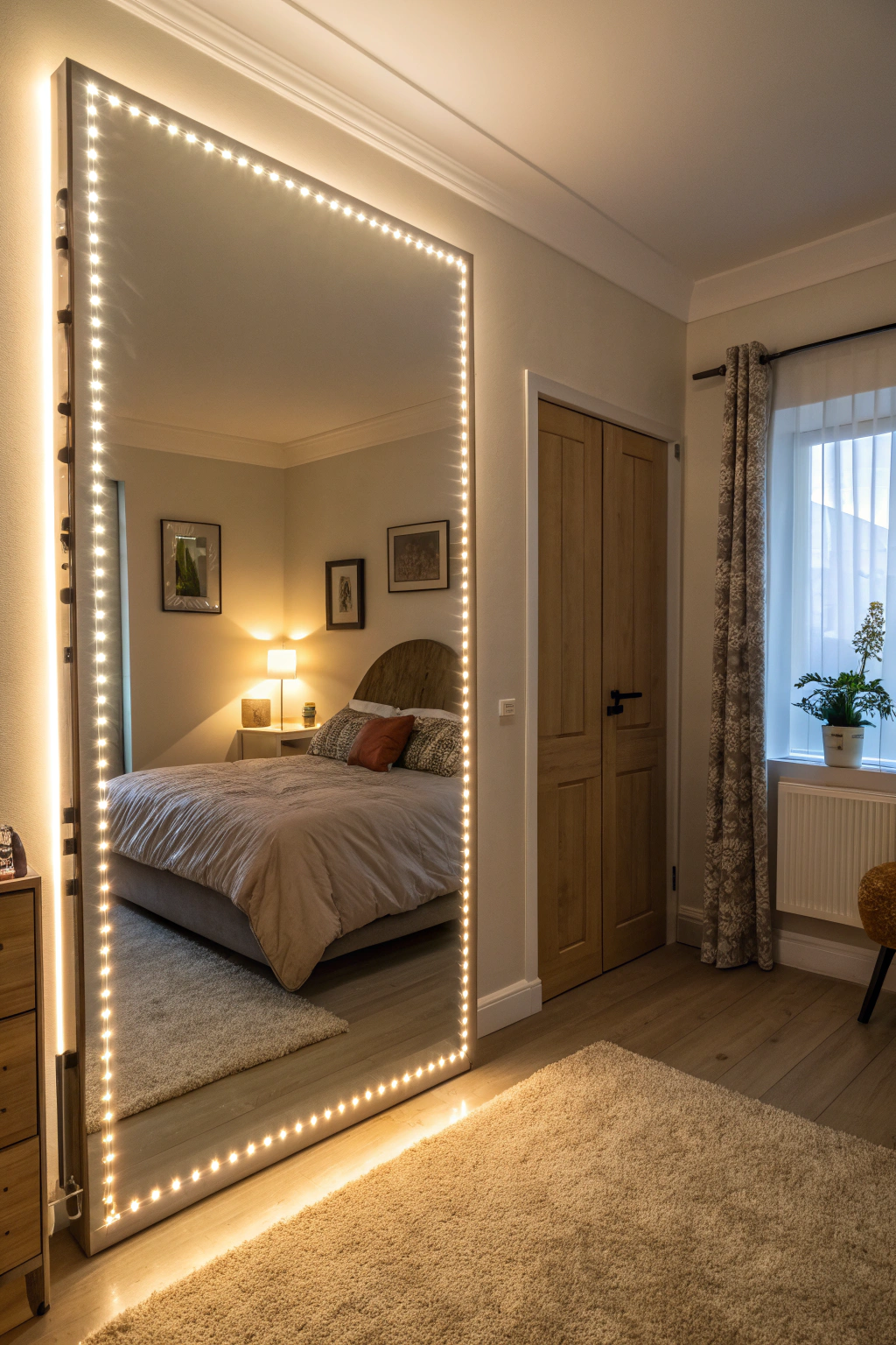 PinIlluminate your space with mirror backlighting effects that add depth and ambiance to your bedroom. This stunning technique creates a soft glow, making your room feel larger and more inviting. You can easily achieve this by installing LED strips around the mirror's edges. Adjust the colors and brightness to match your mood, creating a cozy, personalized atmosphere that enhances your decor beautifully.