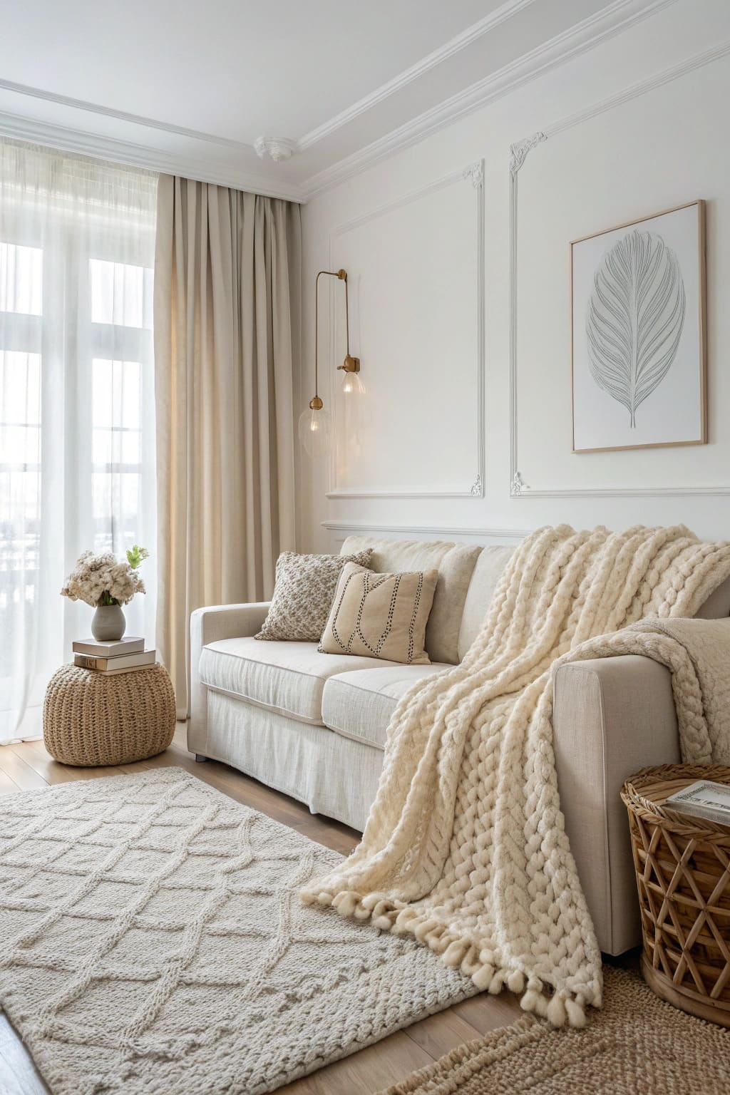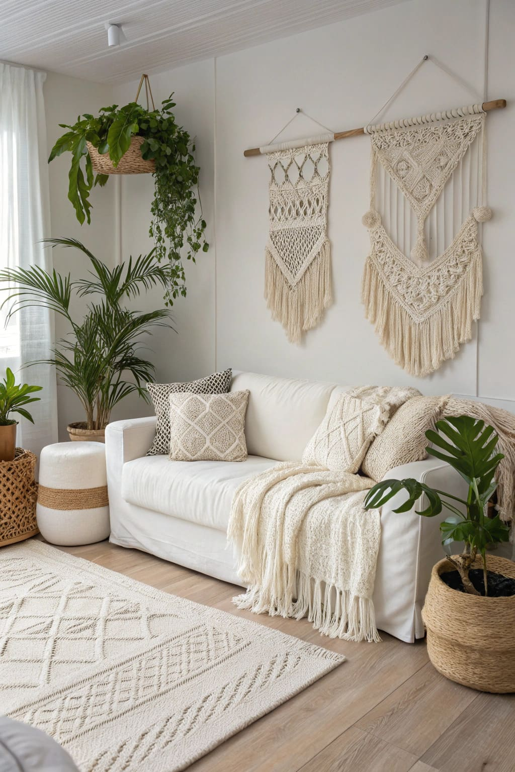 PinBoho-chic white accents can transform your living room into a cozy, stylish sanctuary. Incorporate textured white throw pillows and woven blankets to add depth and comfort. Use macramé wall hangings or a white fringed rug to enhance that laid-back vibe. Don't forget potted plants in white ceramic pots, bringing a touch of nature while maintaining the airy, bohemian feel. Your space will feel effortlessly inviting.