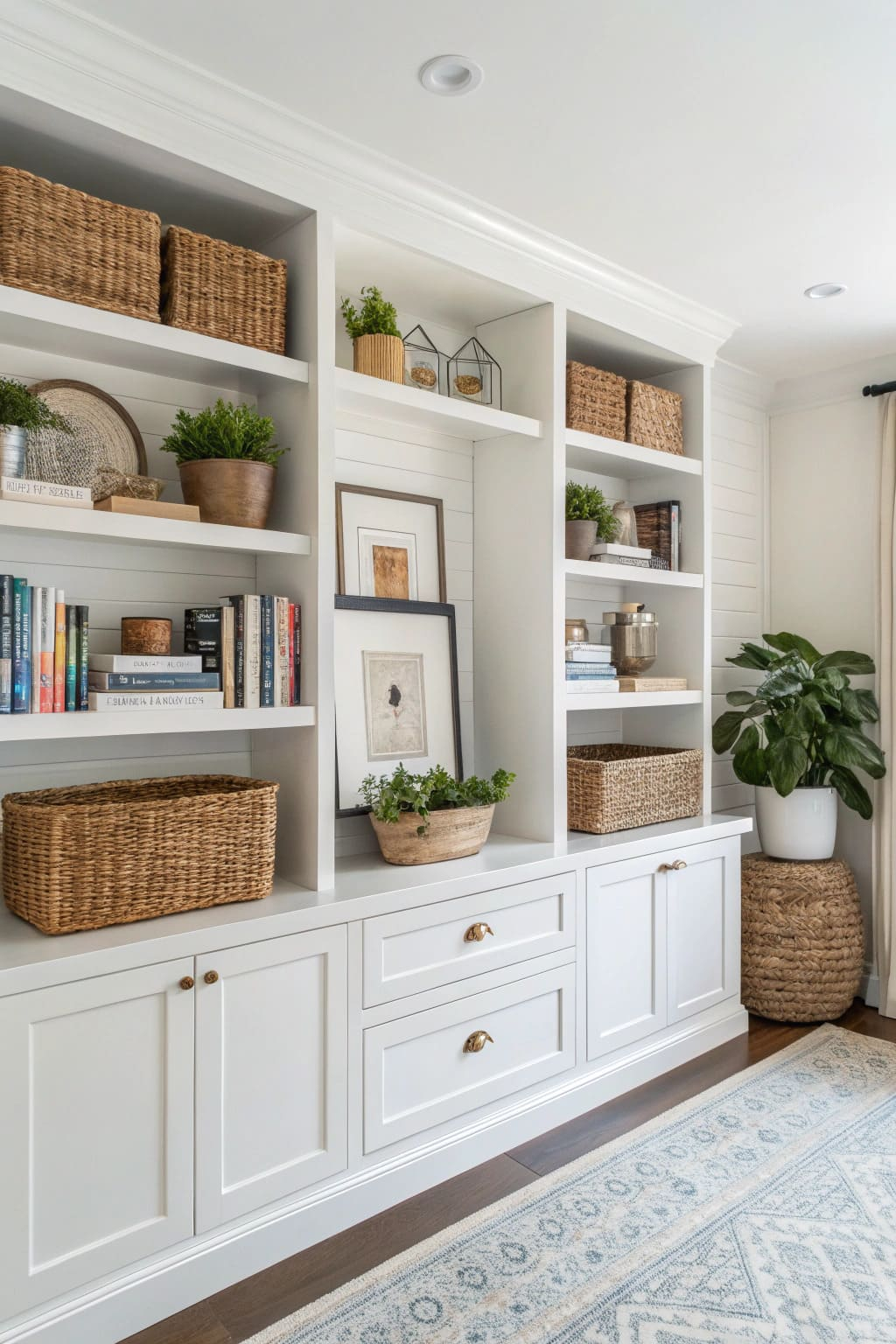 PinCreating functional and stylish open shelving displays in your white living room can transform its aesthetic and increase storage efficiency. Consider showcasing your favorite books, decorative items, and plants to add personality. Use uniform baskets or boxes for a tidy look, and incorporate varying shelf heights to create visual interest. These displays not only serve a practical purpose but also enhance your room's overall ambiance.