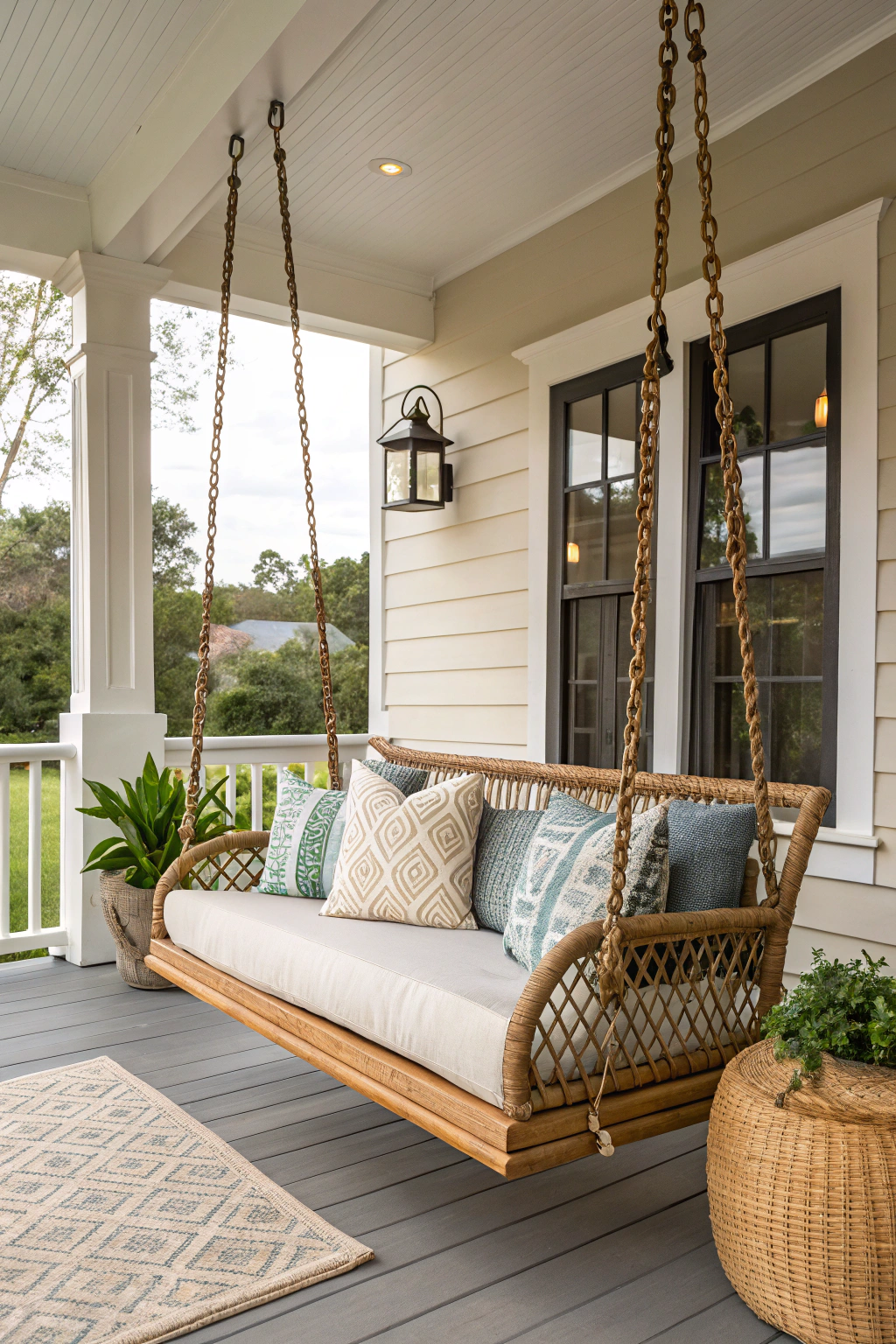 - Woven rattan swing for a boho vibe