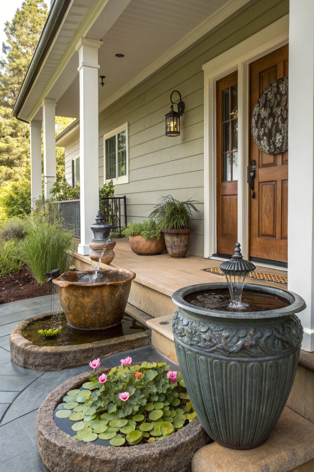 PinAdding small-scale water features to your front porch can enhance the tranquil atmosphere you're aiming for with your handcrafted planters. Consider a petite fountain or a birdbath; both create soothing sounds and attract curious wildlife. Position a small pond or a decorative bowl filled with water and floating lilies to bring serenity and charm to your outdoor space. You'll love the inviting vibe!