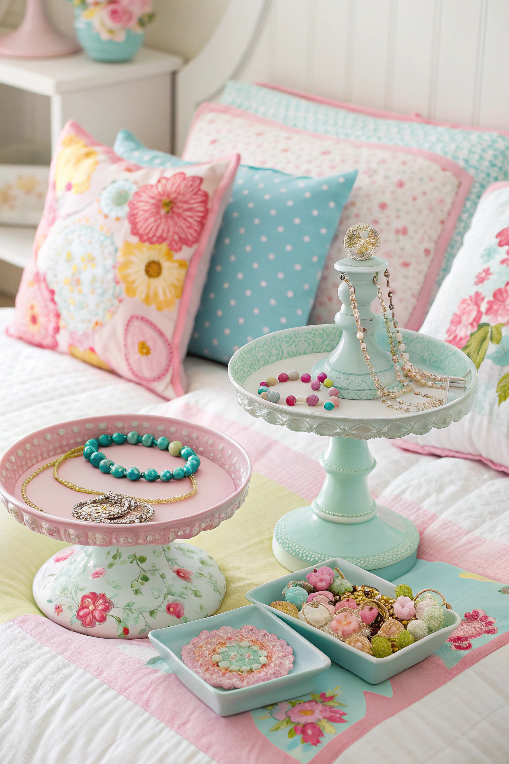 PinBright, playful bed linens can set the perfect backdrop for showcasing your vintage jewelry collection. Use decorative trays, chic stands, or shadow boxes to keep your pieces organized and easy to access. Mix in some colorful elements, like flower-patterned fabric or pastel hues, to enhance your display. Remember, the right arrangement not only protects your treasures but also adds flair to your girly room decor!