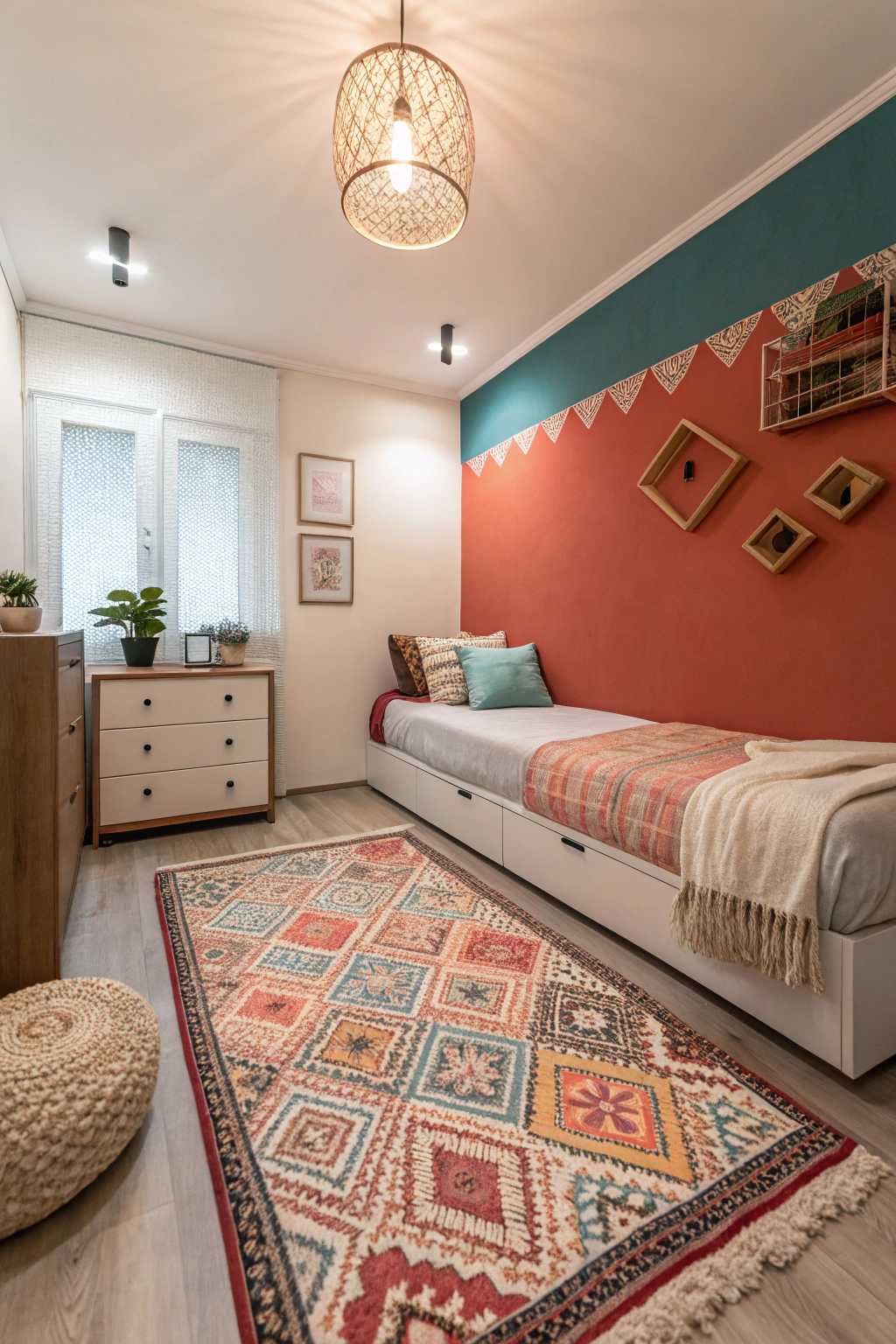 PinAfter adding a bold accent wall, consider how decorative rugs can further enhance your small bedroom's aesthetic. A well-chosen rug adds warmth and texture, drawing the eye and tying your dΓ©cor together. Opt for vibrant patterns or soothing neutrals, keeping the size in mind to prevent overwhelming the space. Layering rugs can also create depth while keeping the cozy vibe you desire.