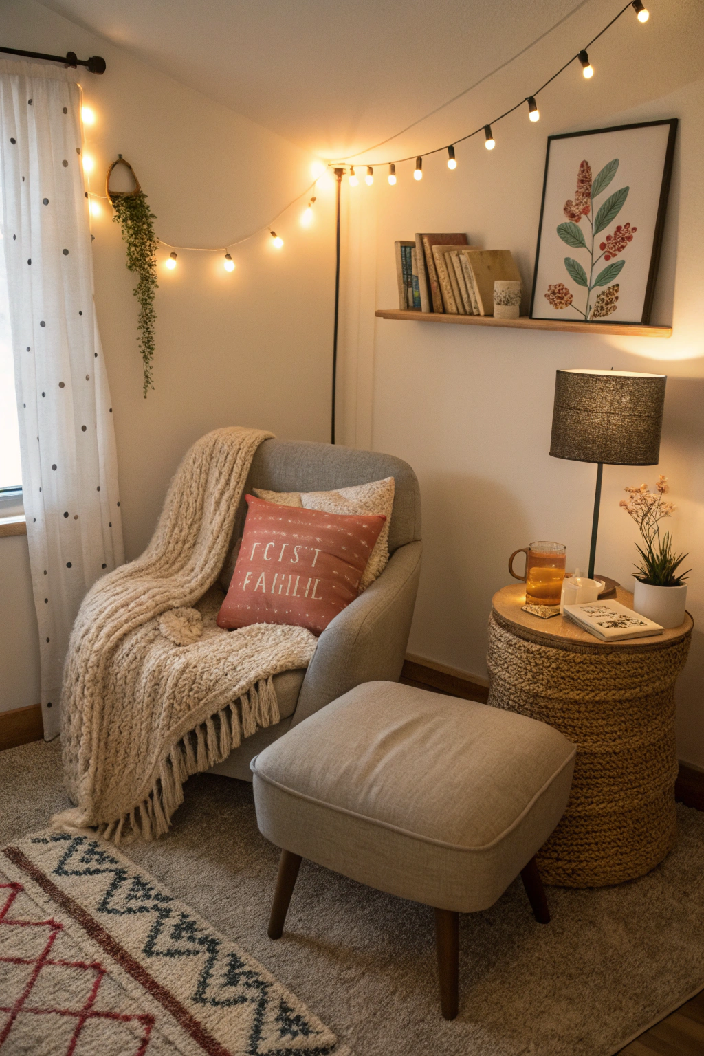 PinHow can you turn a corner of your small bedroom into a cozy nook? Start by selecting a comfy chair or oversized floor cushion. Next, add a soft throw blanket and some decorative pillows for warmth. Incorporate a small side table for drinks or books. Finally, enhance the atmosphere with a warm lamp or string lights to create an inviting vibe.