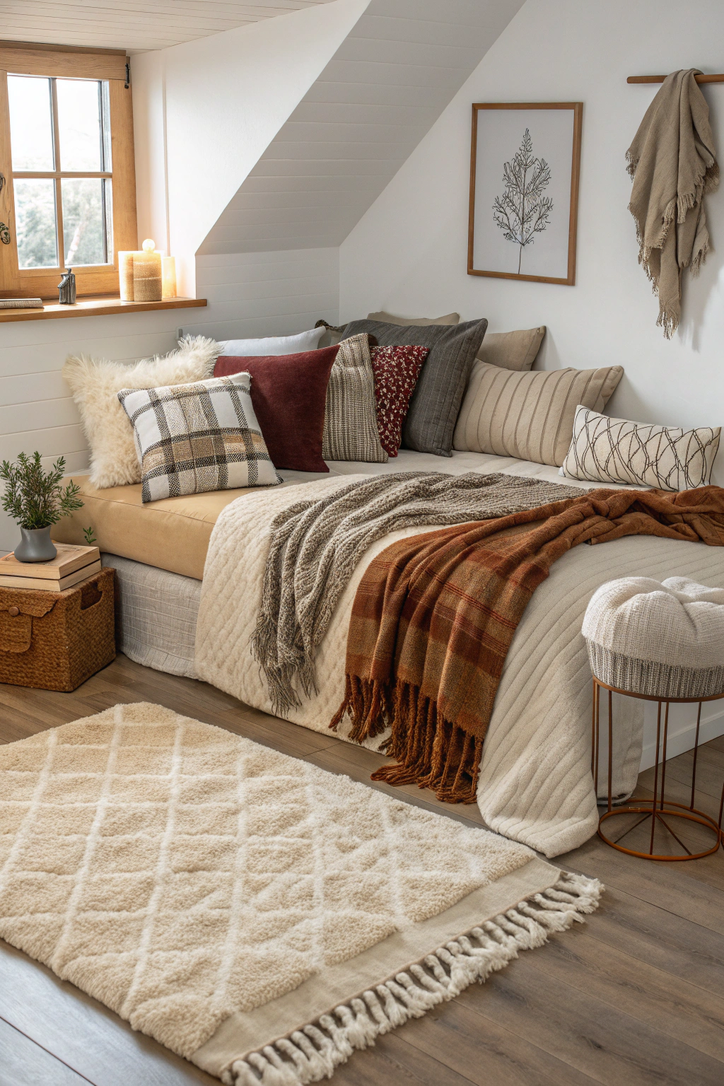 PinIn a small bedroom, layering textiles can create a cozy and inviting atmosphere while adding depth and dimension. Start with a plush area rug for warmth, then mix different throw pillows and blankets on your bed or seating. Incorporate various materials like cotton, wool, and velvet to enhance tactile appeal. This approach not only adds style but also makes your space feel more comfortable and personalized.