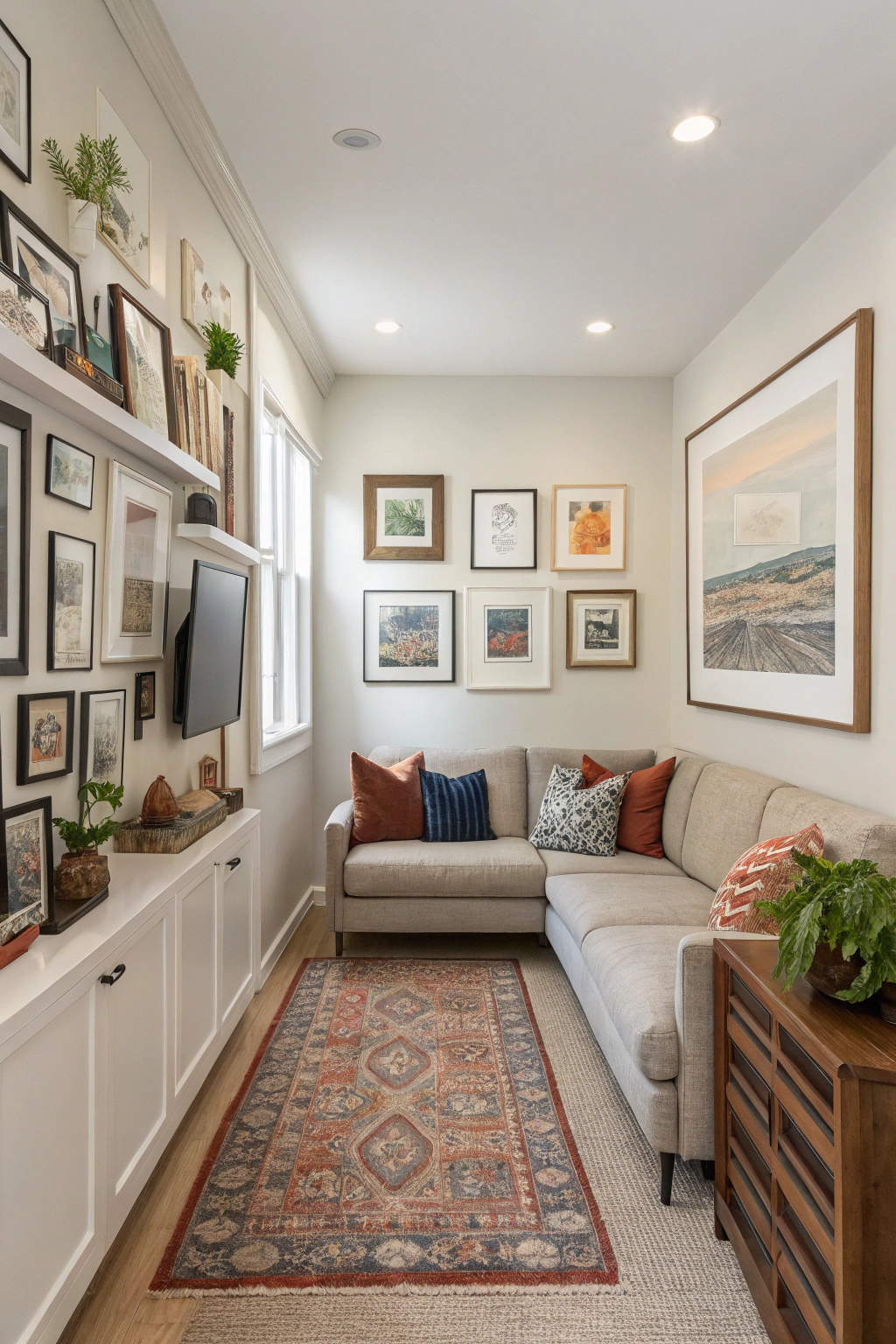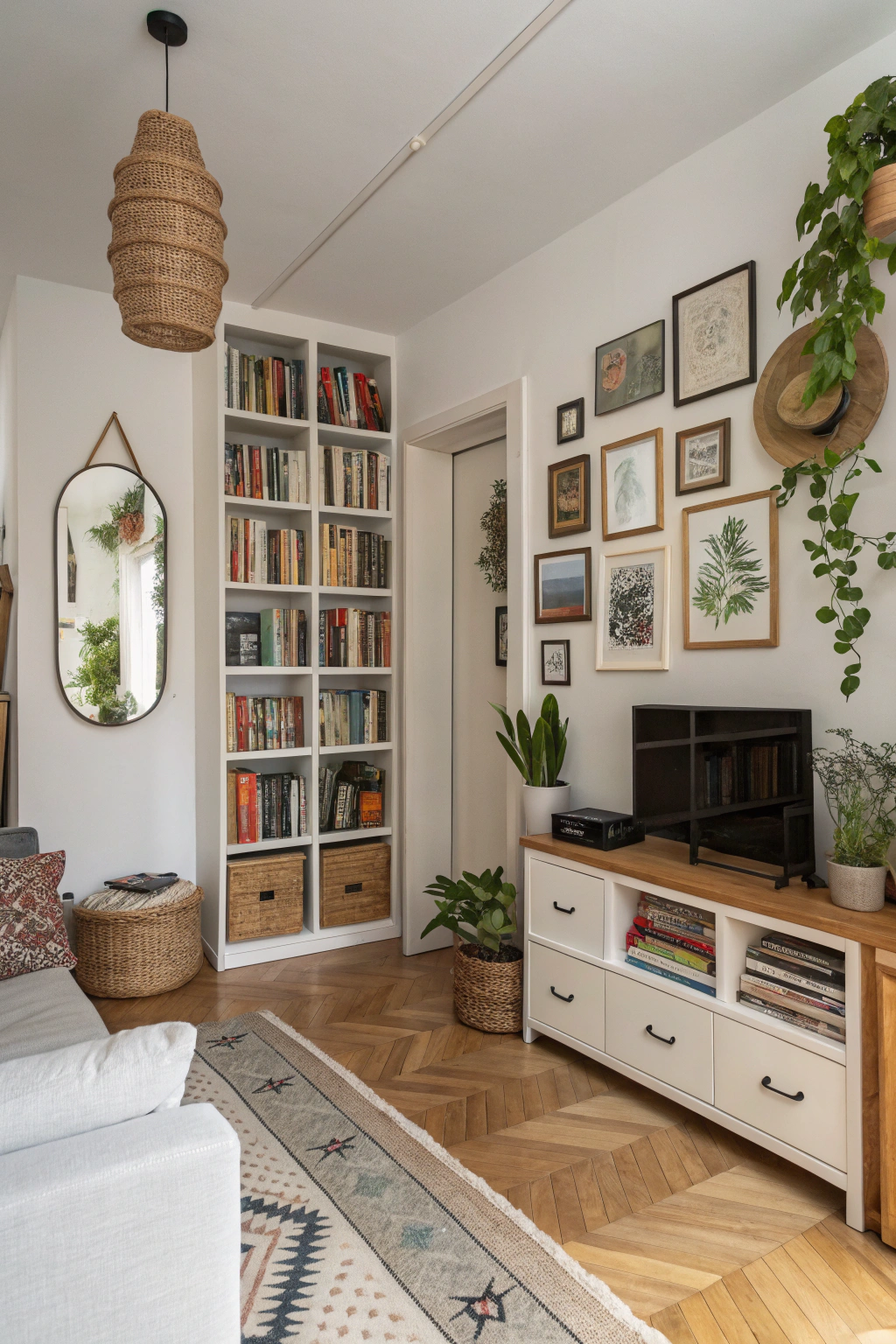 PinMaximizing wall space is just as important as finding clever storage solutions. Use your walls to showcase art, creating a focal point in your tiny living room. Hang pieces at eye level to draw attention and make the space feel larger. Consider a gallery wall or oversized artwork to add personality, while keeping the layout balanced to avoid overwhelming the area.