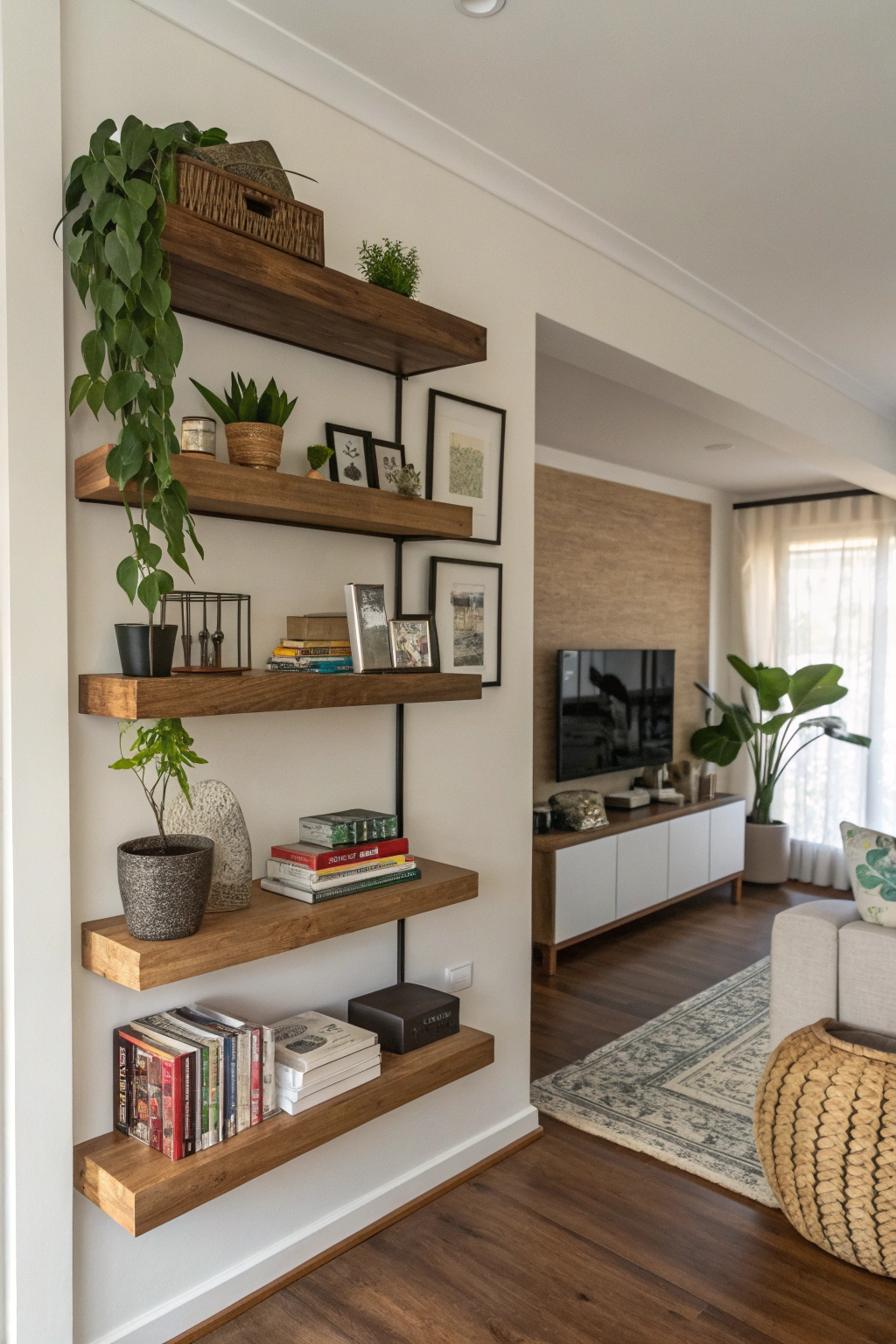 PinTaking advantage of your vertical space doesn't stop with tall bookshelves; adding floating shelves can further enhance your tiny living room's functionality and style. These versatile shelves let you showcase decor, store books, or display plants without sacrificing floor space. You can install them at varying heights for visual interest, creating a personalized look that maximizes your room's potential while maintaining an open feel.
