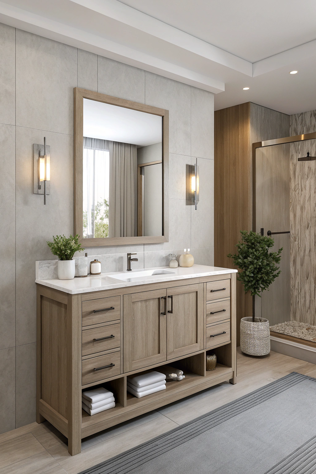 - Opt for a minimalist vanity design with clean lines and integrated storage for a sleek, modern edge.