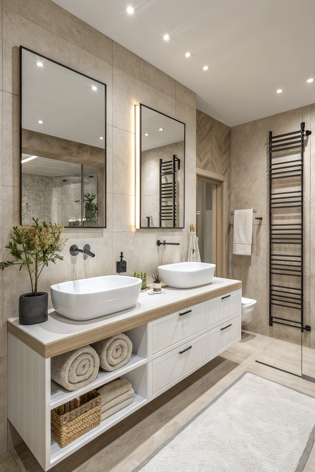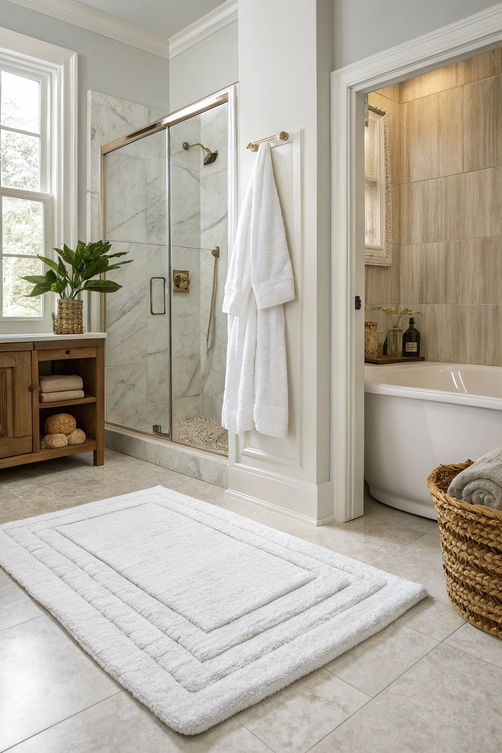 Opt for soft, neutral textiles, such as plush towels or a cozy rug, to add comfort.
